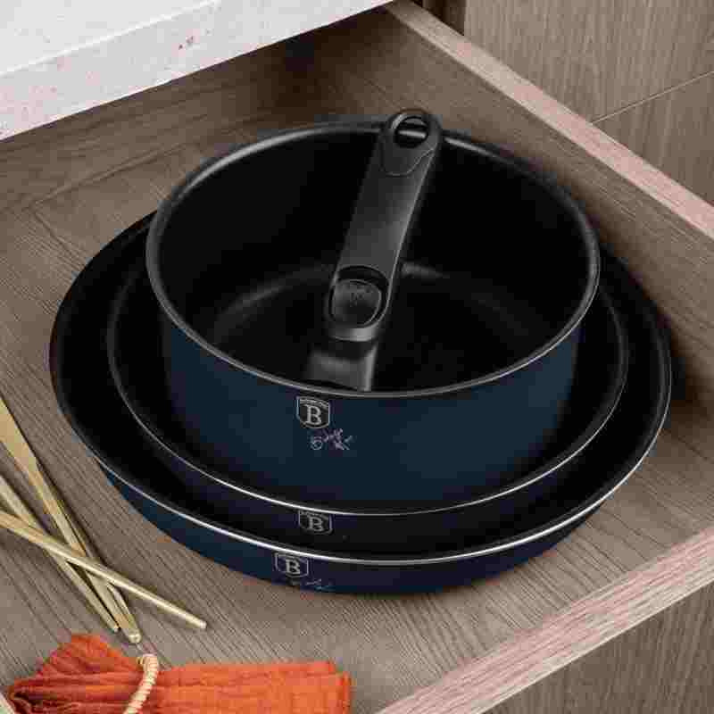 Súprava riadu Berlinger Haus - TitanPro Kliknite na tlačidloObjavte súpravu riadu Berlinger Haus, ktorá spája praktickosť, štýl a moderné technológie. Táto súprava si poradí s každou kuchynskou úlohou - od vyprážania a dusenia až po pečenie. Vďaka stohovateľnému dizajnu ušetríte miesto v kuchyni a šikovné pokrievky uľahčujú manipuláciu pri varení. Ergonomické rukoväte Click It a mäkké gombíky Stay Cool zabezpečujú pohodlnú a bezpečnú prácu bez popálenia.Minimalistický matný povrch v kombinácii modrého a sivého dreva dodáva súprave elegantný vzhľad, zatiaľ čo turboindukčná základňa zabezpečuje rýchle a rovnomerné varenie. Pokrievky z tvrdeného skla so systémom Soft Close umožňujú bezpečnú manipuláciu a kontrolu varenia.Obsah súpravy:- Panvica s priemerom 20 cm x 4,5 cm - 1,0 l- Panvica s pokrievkou (cedník) s priemerom 24 cm x 4,8 cm - 1,7 l- Hrniec s hrdlom s priemerom 16 cm x 7,5 cm - 1,2 l- Hrniec s pokrievkou (cedník) s priemerom 20 x 8,4 cm - 2,2 l- 2 plastové hrnce- 1 silikónová podložkaŠpecifikácia:- Materiál: hliník s 3-vrstvovým nepriľnavým povrchom TitanPro- Ergonomické mäkké gombíky Stay Cool so striebornou vložkou- Pokrievka z tvrdeného skla so žiaruvzdorným silikónovým systémom Soft Close- Vhodné do rúry bez pokrievky a rukoväte Click It- Otvor na paru- Minimalistický štýl, matný povrch- Turboindukcia pre rýchle a rovnomerné varenie- Šetrný k životnému prostrediu - neobsahuje PFOA, olovo a kadmium- Ľahko sa čistíPraktická a štýlová súprava riadu na každodenné varenie s maximálnou bezpečnosťou a komfortom.