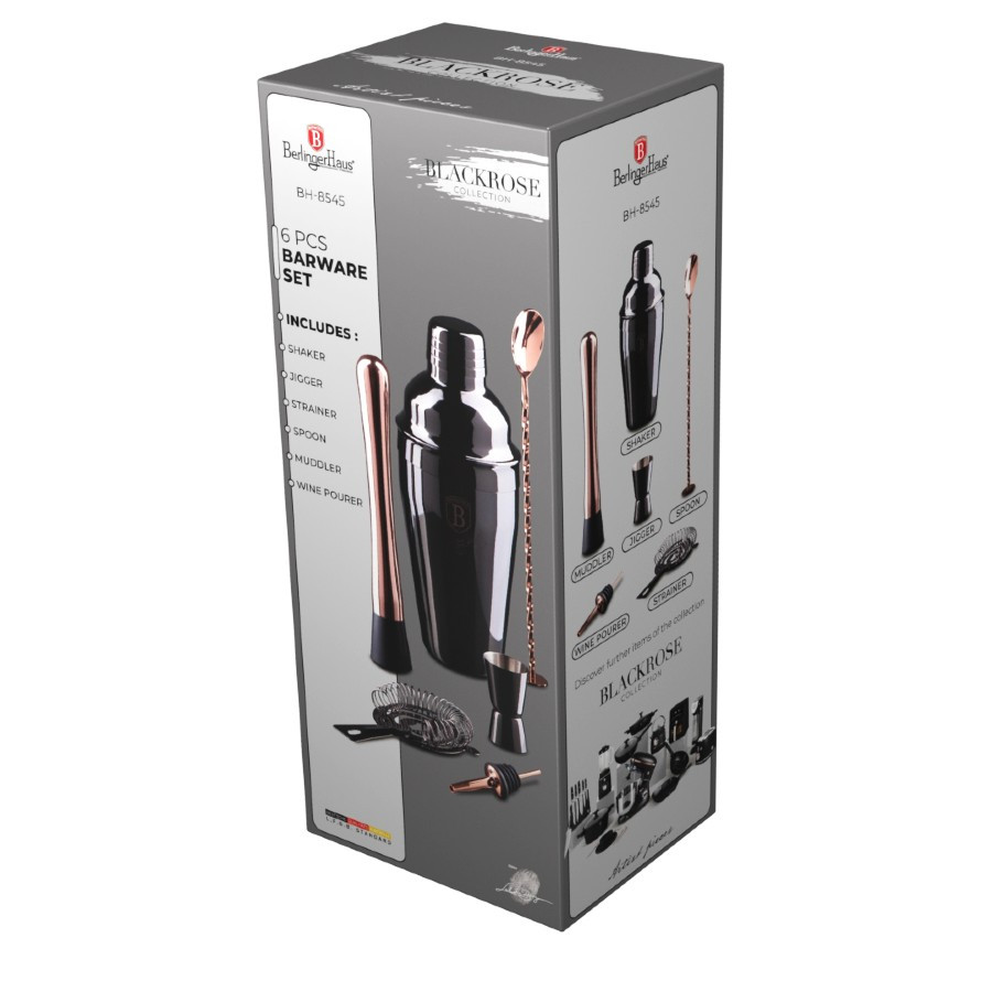 - kompletný barmanský set v atraktívnom čierno/ružovom prevedení - materiál: nerezová oceľ - lesklý čierny povrch, vnútorný nerezový - kvalitné prevedenie, dlhá životnosť - vhodné do umývačky riadu, na zachovanie dlhotrvajúceho dokonalého vzhľadu sa však odporúča ručné umývanie - kompletná sada 6 ks obsahuje: - 1x shaker na koktaily s viečkom: objem 0.55 l - 1x sitko na cedenie priamo zo shakera - 1x miešacia lyžica - 1x obojstranná odmerka - 1x muddler - 1x lievik