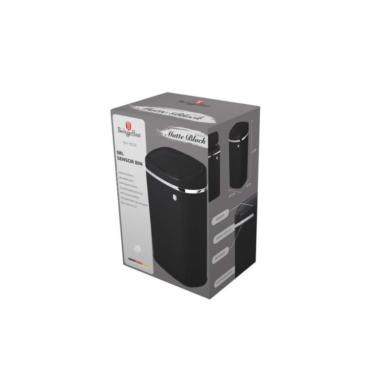 - odpadkový kôš vhodný do kuchyne aj kúpeľne alebo wc - tichý senzorový systém veka - 4 ks AA batérie nie sú súčasťou balenia - telo aj veko vyrobené z nerezovej ocele - rozmery 67x39,5x28 cm - objem: 58 litrov - kolekcia Matte Black Colelection - značka BerlingerHaus