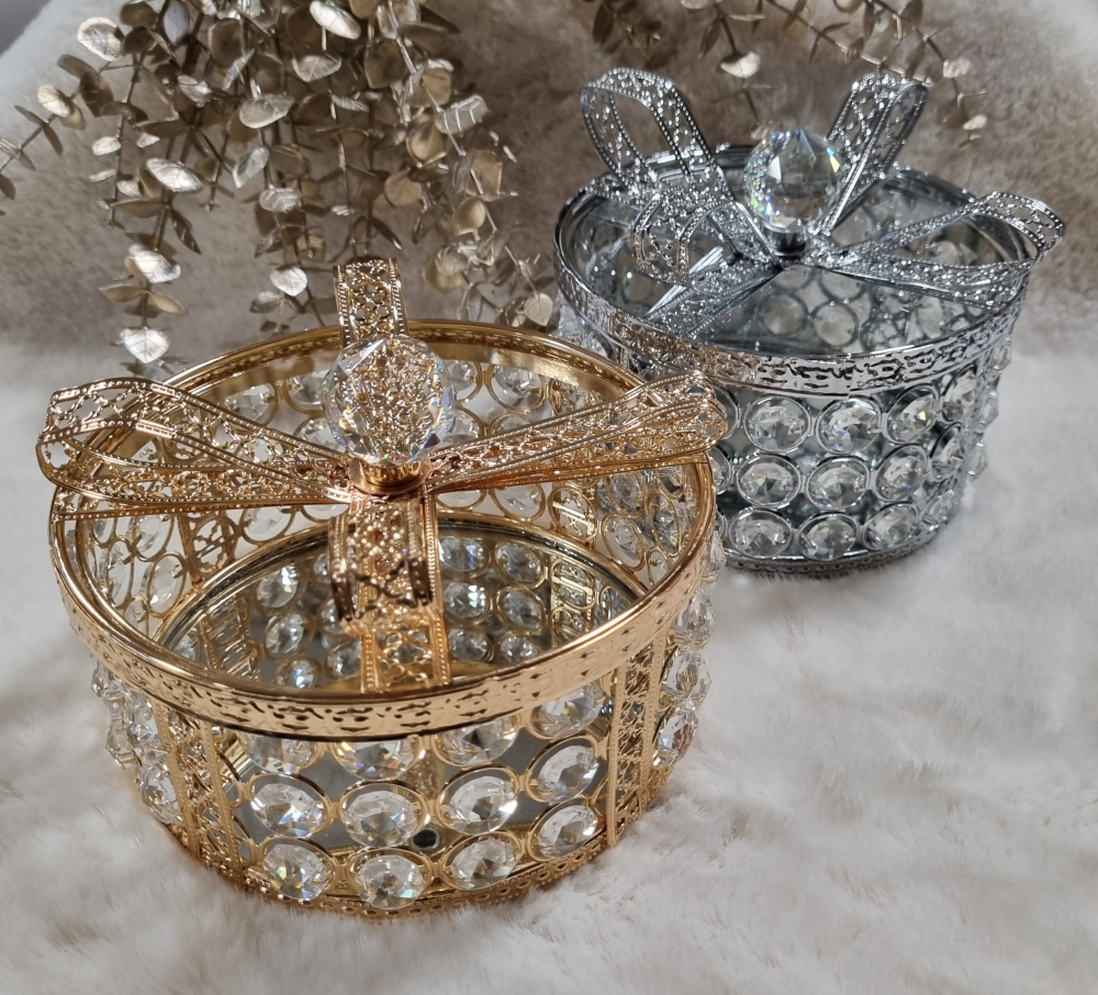 Krištáľová krabička v tvare darčeku vyzerá veľmi efektne a elegantne. Krabička môže byť ozdobou každého interiéru, napríklad ako efektný akcent do izby či spálne alebo kúpeľne. Je kompletne opletená kryštálikmi a predstavuje jedinečné doplnenie výzdoby každého priestoru.