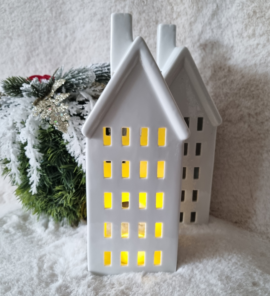 Dekoratívny dom krásne vynikne počas celého roka. Domčeky sú krásnou tradíciou v zimnom a vianočnom období.Vysoký dom na čajové sviečky je vyrobený z bielej keramiky a láskyplne navrhnutý s mnohými oknami cez ktoré sa svetlo atmosfericky trblieta.