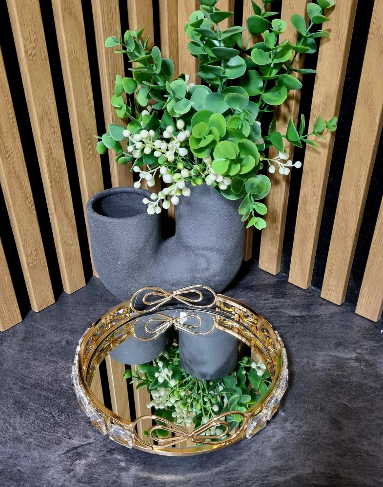 Elegantný dizajnový / dekoratívny podnos v zlatej farbe (ružové-zlato) s kamienkami a zrkadlom je ideálnym doplnkom do každého interiéru. Skvele poslúži ako tanier pod sviečky, dekoratívna miska, ozdobný podstavec na šperky, dekorácia stola alebo obývačky v štýle GLAMOUR. Vrchná časť patery je zrkadlová, čo jej navyše dodáva ešte väčší šarm.