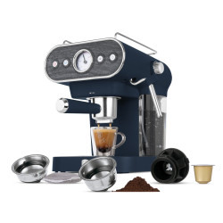 Elegancia a výkon v jednom kávovareObjavte nový rozmer prípravy kávy s naším kávovarom Espresso, 3 v 1, matná modrá. Tento štýlový a výkonný kávovar je navrhnutý tak, aby uspokojil aj tých najnáročnejších milovníkov kávy. Jeho elegantný dizajn v matnej modrej farbe s drevenými akcentmi z neho robí výstavný kúsok v každej kuchyni. Jeho všestrannosť vám umožní vychutnať si mletú kávu, kávové kapsule a kapsule ESE s maximálnym pohodlím a ľahkosťou.Výhody, ktoré oceníte Všestrannosť: podporuje mletú kávu, kávové kapsule kompatibilné s Nespresso a kapsule ESE. Rýchly ohrev: systém rýchleho ohrevu zabezpečí, že vaša káva bude pripravená v okamihu. Profesionálny napeňovač mlieka. Bezpečnosť na prvom mieste: Ochrana proti prehriatiu a pretlaku zaisťuje bezpečnú prevádzku. Jednoduchá údržba: Odnímateľná a umývateľná odkvapkávacia miska uľahčuje každodenné čistenie.Ideálna voľba pre milovníkov kávyTento kávovar je ideálny pre každého, kto si chce vychutnať luxusný zážitok z kávy v pohodlí domova. Ak patríte k ľuďom, ktorí si radi vychutnávajú rôzne druhy kávy, od espressa až po cappuccino, tento kávovar je pre vás ten pravý. Je navrhnutý tak, aby uspokojil začiatočníkov aj skúsených baristov. Vďaka kompaktnému dizajnu je vhodný do menších kuchýň, kde sa stane nielen praktickým, ale aj estetickým doplnkom.Podrobné technické špecifikácie Materiál: nehrdzavejúca oceľ Príkon: 950 W Napätie: 220-240 V, 50-60 Hz Nádržka na vodu: 1,2 l Filter: pre 1 a 2 šálky Plastová lyžica 2 v 1 s napeňovačom Rozmery: 23 x 26,5 x 30,5 cm Dĺžka napájacieho kábla: 75 cm Farba: matná modrá, drevená Tlakové čerpadlo: 20 barov Predhrievač šálok: nerezová oceľ Teplomer na monitorovanie teploty vodyVylepšite svoj kávový rituál s naším espresso kávovarom 3 v 1, matná modrá, ktorý ponúka dokonalú kombináciu štýlu, funkčnosti a bezpečnosti. Je to kvalitná investícia, ktorú oceníte každý deň.