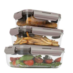 Technické parametre:- materiál: sklo, plast, silikón- objem:- 160,5*112,5*53 mm, 570 ml- 183*125,5*59 mm, 840 ml- 203,5*144*64,5 mm, 1180 ml- farba: taupeVlastnosti:- Praktické na skladovanie potravín- Vzduchotesná nádoba- Borosilikátové sklo - odolné voči teplu do 200 °C (okrem veka)- Vhodné do mikrovlnnej rúry- Možno umývať v umývačke riadu- Jednoduché skladovanie- Jednoduché čistenie