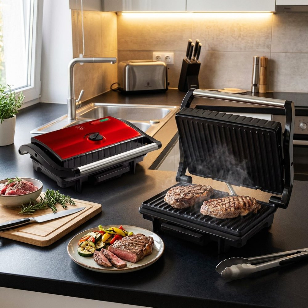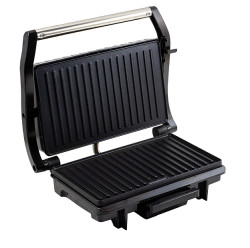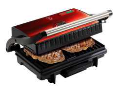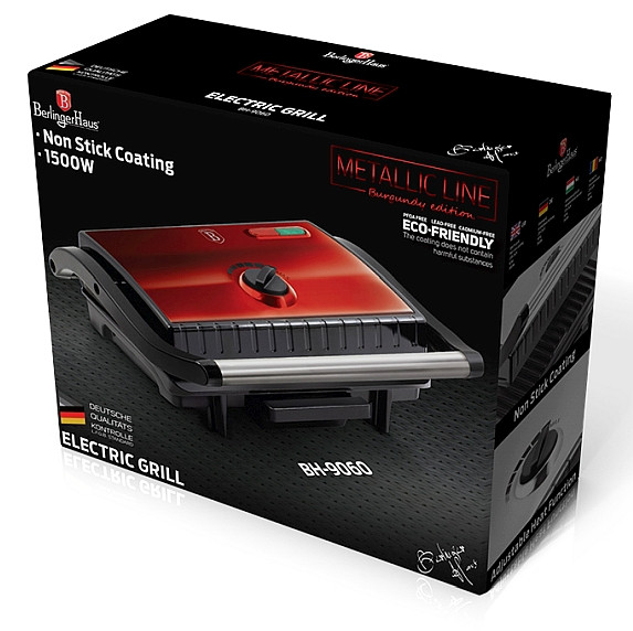 - výkon: 1500 W - 220-240 V 50/60 Hz - nepriľnavý povrch grilovacích dosiek - svetelný indikátor prevádzky - nastaviteľný termostat - materiál: nerezová oceľ / plast - farba: burgundy metalická - môže byť používaný ako panini alebo kontaktný domáci gril - vyberateľná odkvapkávacia zásuvka na tuk
