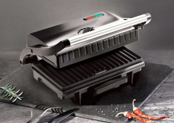 - elektrický domáci kontaktný gril z nerezovej ocele - flexibilné použitie, skvele kombinuje stolný gril na prípravu mäsa a panini gril na prípravu bagiet a sendvičov - ideálny pre grilovanie mäsa, steakov, burgerov, párov, zapekaných sendvičov, bagiet a panini - nepriľnavý povrch grilovacích dosiek zaistí, že sa potraviny nepripaľujú a navyše je veľmi ľahké povrch čistiť - automatický svetelný indikátor prevádzky - nastaviteľný termostat - ochrana proti prehriatiu - rukoväť sendvičovača zostáva vždy chladná aj počas použitia - vyberateľná odkvapkávacia zásuvka na tuk - výkon: 1500 W - rozmery grilovacej plochy: 25 x 15 cm - kolekcia Carbon PRO Line