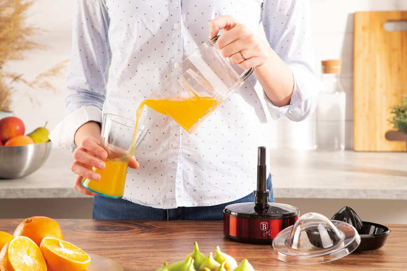 - elektrický lis na citrusy Vám uľahčí vytláčanie ovocných štiav - lis veľmi rýchlo a efektívne vytlačí šťavu z rôznych citrusových plodov - citrusovač využijete aj pri príprave pokrmov či dochutení vody alebo čaju - obojsmerný chod lisovania pre maximálnu efektivitu vytlačenia šťavy - dobre čitateľná odmerná stupnica - postranný lievik umožní prelievať čerstvú hotovú šťavu priamo z lisu - všetky jednotlivé súčasti lisu sú dobre rozložiteľné a prístroj sa tak jednoducho čistí - objem nádoby na vylisovanú šťavu: 0,7 litra - príkon: 40 W - napätie: 220-240 V - transparentná nádoba na šťavu - kolekcia Burgundy Metallic Line - značka BerlingerHaus