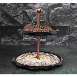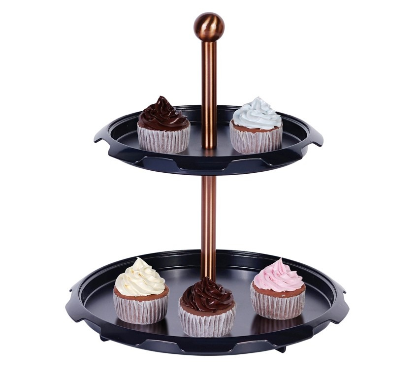 - materiál: chrómovaná oceľ s farebnou úpravou, plast - rozmery: - veľká tácka pr. 30,5 cm - malá tácka pr. 24 cm - výška: 33 cm - dvojposchodový etažér na servírovanie či vystavenie rôznych pokrmov - najčastejšie využívaný ako stojan na vianočné pečivo - vhodný nielen na pečivo, tortičky, zákusky, muffiny, makrónky, ale aj ovocie alebo slané chuťovky - stredová opora z chrómovanej ocele - premyslená stredová os je v hornom bode zakončená malou rukoväťou pre pohodlné prenášanie stojana