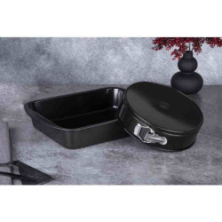 - Materiál: uhlíková oceľ s titánovým nepriľnavým povrchom - Súčasťou balenia je: - Podlhovastý pekáč 40 * 28,5 * 7 cm - Okrúhla pružinová forma 24 * 6,8 cm - Farba: čierna metalíza - titánová čierna nepriľnavá vrstva - Vyrobené z ťažkej ocele - Silná stena korpusu, hĺbka bočnej steny 7 cm- Štýlový- Špeciálna metalická edícia- Elegantný dizajn s metalickou vonkajšou farbou (funkčný a štýlový riad, ktorý vyhovie každému!).- Ľahko sa čistí- Šetrný k životnému prostrediuBez PFOA, LEAD, kadmia