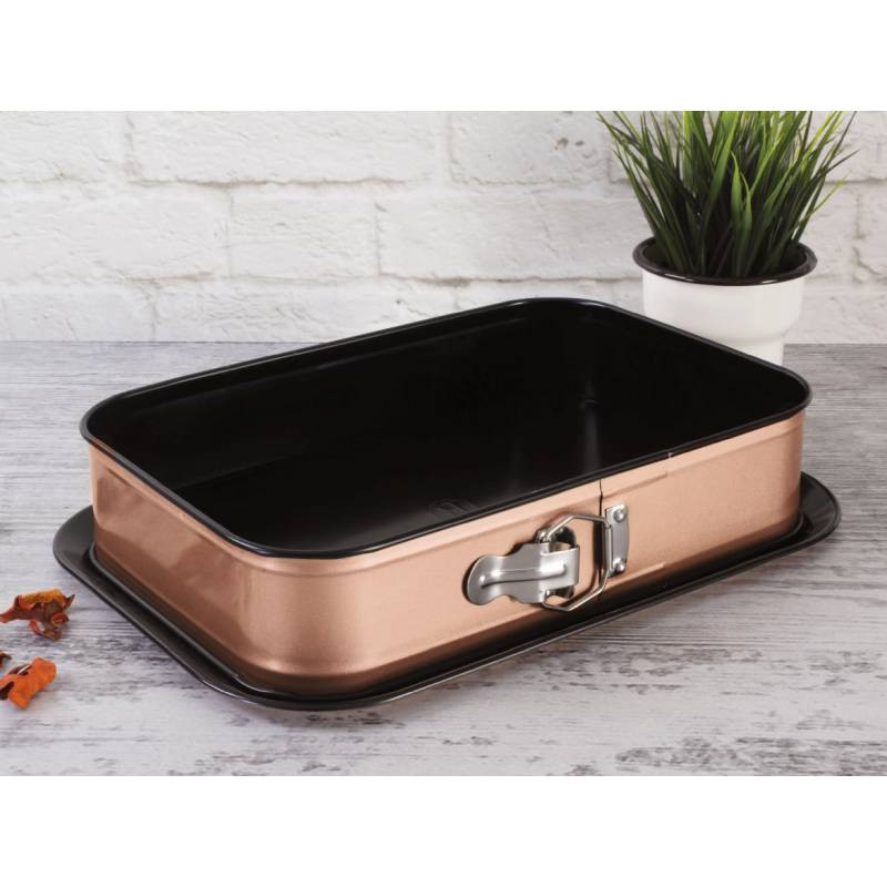 - materiál: uhlíková oceľ s nepriľnavým povrchom - nepriľnavý povrch vhodný na pečenie s minimom tuku - veľmi pohodlná údržba, jedlo sa nepripaľuje - rozkladacia forma s oddeliteľným dnom - spodný diel v sade využiteľný ako servírovacia tácka - rozmery: 39 x 27 x 7.5 cm - vhodné do rúry do teploty 240 ° C - rosegold metalická vonkajšia farba - ECOfriendly, neobsahuje žiadne škodliviny ako Pfoa, olovo ani kadmium