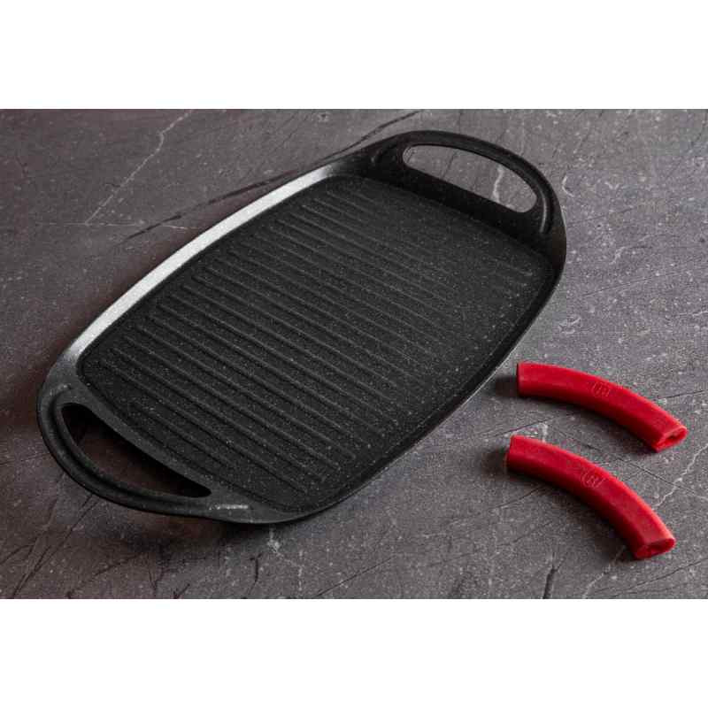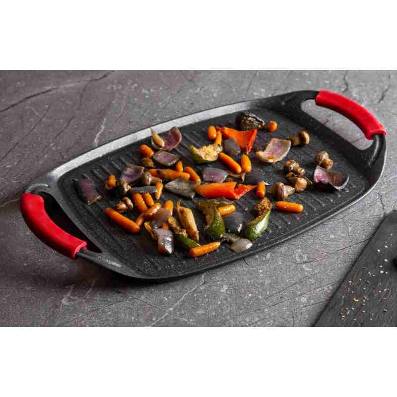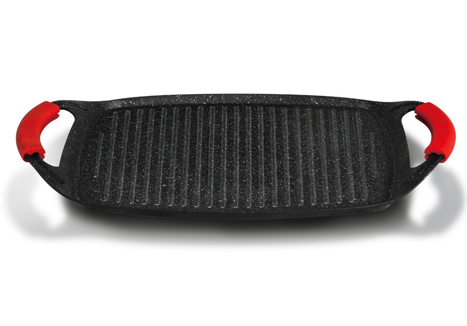 Grilovacia doska z kolekcie riadu Burgundy Edition s mramorovým povrchom je perfektná na grilovanie doma aj vonku. Použiť je možné na všetky druhy sporákov, v rúre, alebo vonku na vašom grile. Veľmi efektný je aj na priame servírovanie grilovaných špecialít. Vďaka šikovne vyriešeným rukovätiam je manipulácia pohodlnejšia a bezpečnejšia ako pri klasických táloch. Na doske je možné pripravovať mäso, zeleninu, ryby, klobásky, burgre, volské oká alebo aj pizzu, vďaka mramorovému povrchu navyše s minimom tuku, či už na sporáku, v rúre alebo na grile. - materiál: tlakovo liaty hliník s mramorovým povrchom - trojvrstvový nepriľnavý povrch s mramorovým dizajnom na varenie s minimom tuku - rozmery: 47 x 29 x 4.6 cm - odnímateľné silikónové rukoväte - TURBO indukčné dno - možno použiť v rúrach na pečenie, teplotný rozsah: -20°C až +240°C - vhodné na všetky druhy sporákov, aj na indukciu - vhodné do umývačky riadu