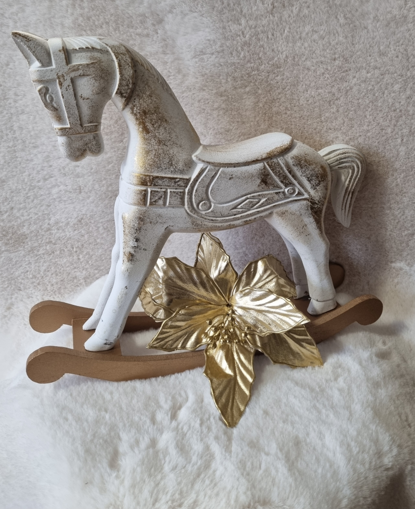 Výnimočná dekorácia do domu – hojdací koník. Prezentovaný model je dokončený v bielo-zlatej farbe. Hojdací kôň je zo zámeru štylizovaný ako starý, preto na ňom sú početné odreniny a starnutia.Zaručene sa bude dobre vynímať napríklad na komode alebo okne čí pod vianočným stromčekom.