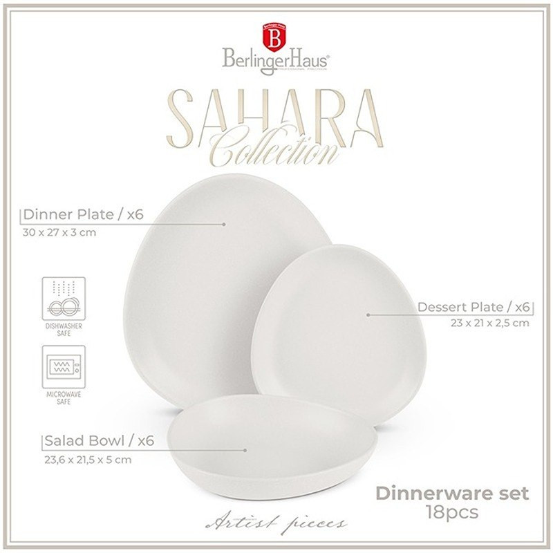 Elegantný 18-dielny riad – Berlinger Haus BH-10020 Sahara: Zvýšte svoj zážitok zo stolovania. Pri stolovaní záleží na každom detaile. Súprava 18-dielneho riadu Berlinger Haus BH-10020 Sahara nie je len zbierkou tanierov a mís – je to vyjadrenie elegancie, vycibrenosti a bezkonkurenčnej kvality. Táto skvelá sada riadu, vytvorená pre tých, ktorí oceňujú v živote jemnejšie veci, premení každé jedlo na zvláštnu príležitosť. Dokonalé spojenie formy a funkcie. Súprava Berlinger Haus BH10020 Sahara je vyrobená z kameniny prvotriednej kvality, ktorá zaisťuje odolnosť a dlhú životnosť. Kamenina, známa svojou odolnosťou a vlastnosťami zadržiavania tepla, je ideálnym materiálom pre tých, ktorí hľadajú vo svojom riade krásu aj praktickosť. Kameninová konštrukcia poskytuje pevný, výrazný pocit v ruke, čo vám dáva dôveru v jej trvalú kvalitu. Súprava obsahuje: 6 ks jedálnych tanierov: 30 x 27 x 3 cm 6 ks šalátových misiek: 23,6 x 21,5 x 5 cm 6 ks dezertných tanierov: 23 x 21 x 2,5 cm Každý kus je starostlivo vyrobený podľa najvyšších štandardov, čo zaisťuje jednotnosť veľkosti a tvaru, čo je rozhodujúce pre súdržné prestieranie stola. Prednosti BH-10020: Trvanlivosť, ktorej môžete dôverovať: Kamenina je známa svojou odolnosťou voči lámaniu a praskaniu, čo zaisťuje, že táto sada riadu bude súčasťou vášho domova po mnoho rokov. Vhodné do mikrovlnnej rúry a umývačky. Kľúčom je pohodlie. Súprava Berlinger Haus BH10020 Sahara je plne vhodná do mikrovlnnej rúry a umývačky riadu, takže je ideálna ako na každodenné použitie, tak na zvláštne príležitosti. Ekologická voľba: Kamenina vyrobená z prírodných materiálov je ekologicky šetrnou voľbou. Výberom kameniny sa rozhodujete pre produkt, ktorý je krásny a udržateľný. Ergonomický dizajn: Každý kus je navrhnutý tak, aby nielen dobre vyzeral, ale aby sa dobre držal v ruke. Mierne zvýšené okraje tanierov a pohodlné zakrivenie misiek robia z servírovania a jedla potešenie. Hľadáte ideálny darček? Súprava 18-dielneho riadu Berlinger Haus BH10020 Sahara je ideálna pre svadby, kolaudácie alebo výročie. Jeho nadčasový dizajn a špičková kvalita z neho robia darček, na ktorý budete milovať roky. Navyše je krásne zabalené, pripravené zapôsobiť hneď po vybalení. - Materiál: kamenina prémiovej kvality - 6 ks jedálenský tanier: 30x27x3 cm - 6 ks šalátová misa: 23,6x21,5x5 cm - 6 ks dezertný tanier: 23x21x2, 5 cm - Farba: matná krémová - Matný dizajn - Vhodné do umývačky - Vhodné do mikrovlnnej rúry
