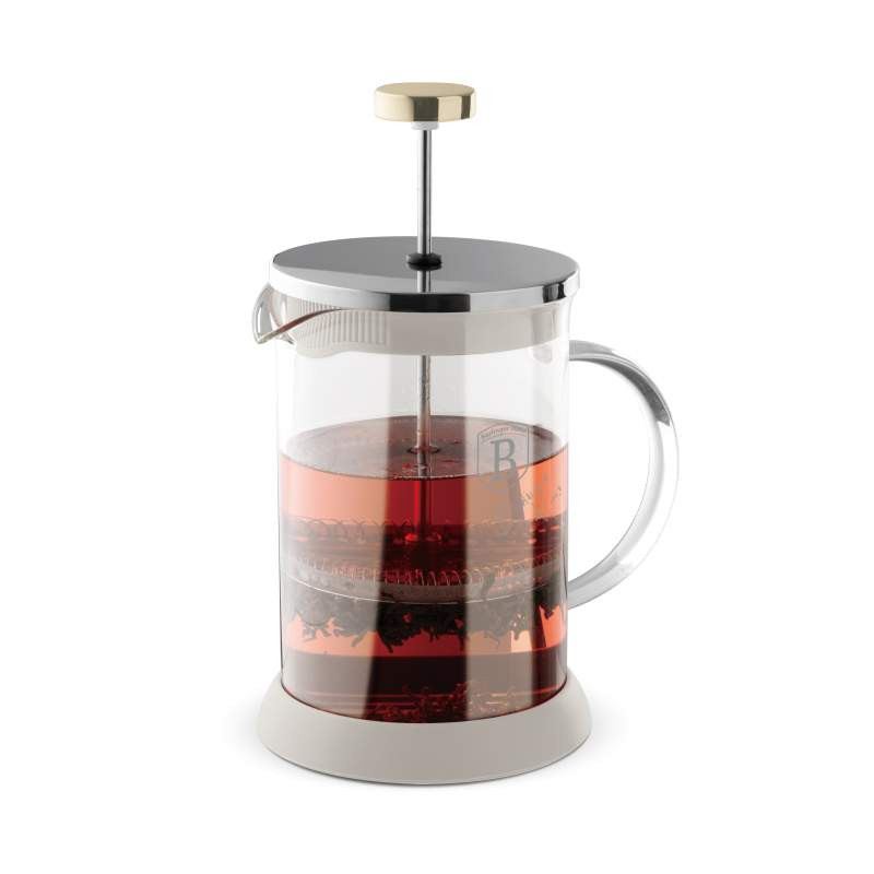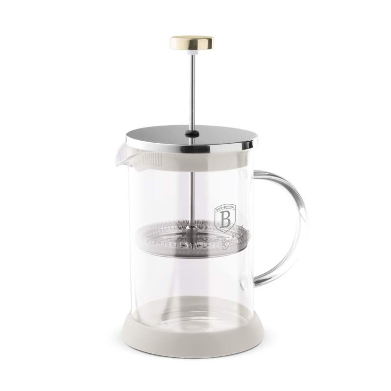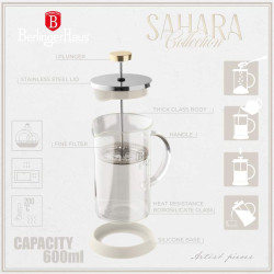 - French Press Sahara Collection značky BerlingerHaus s objemom 0,6 litra - kanvica typu French Press je vybavená odnímateľným filtračným piestom - jeho stlačením dochádza k oddeleniu kávovej alebo čajovej usadeniny az kanvice potom nalievate iba čistý nápoj - veľmi obľúbený a moderný spôsob prípravy kávy alebo sypaného, bylinkového aj ovocného čaju - kanvička je vyrobená zo žiaruvzdorného borosilikátového skla a nemusíte sa v žiadnom prípade báť naliať do nej horúcu vodu - rukoväť je zo žiaruvzdorného silikónu a pri nalievaní tak nikdy nepáli - nerezové prvky z ocele vo vysokej kvalite 18/10 - kanvica je plne rozložiteľná na jednotlivé diely, čo Vám uľahčí jej čistenie - objem kanvičky: 0,6 litra
