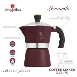 Elegantná a praktická kanvica na espresso z kolekcie Leonardo v matnej bordovej farbe je ideálna na prípravu kávy pre 3 osoby. Pripravte si lahodné espresso, ktoré vás každý deň poteší svojou bohatou chuťou a vôňou. Špecifikácia: • Materiál: hliník • Objem: 3 hrnčeky (150 ml) • Farba: matná bordová Vlastnosti: • Mäkká rukoväť a gombík pre pohodlné a bezpečné držanie – varenie kávy bude skutočnou radosťou • Vynikajúca kvalita spracovania — spoľahnite sa na dlhú životnosť a spoľahlivosť • Rýchle, jednoduché a bezpečné použitie – pre rýchly štart vášho dňa plného energie • Ľahko sa čistí – viac času na vychutnanie si dokonalého espressa Zažite každú šálku ako malý rituál plný potešenia a zdieľania – pretože kvalitná káva si zaslúži tú najlepšiu kanvicu!