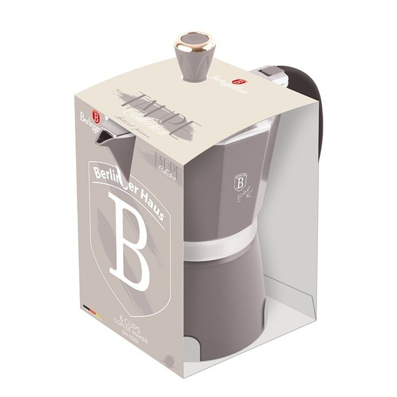 Kanvica na espresso typu moka je prístroj na domáce varenie kávy za použitia vysokého tlaku vodnej pary. Pôvod má v Taliansku, prvá vznikla už v roku 1933. Jedná sa o, dnes už po celom svete, veľmi obľúbený spôsob prípravy kávy. Tradičným materiálom na výrobu vždy bol a je hliník, pretože výborne vedie teplo, zohnať sa dajú aj nerezové. Obsluhovať moka kanvičku je veľmi jednoduché a rýchle, každý sa to bez problémov naučí počas prvého varenia. Do spodnej nádobky sa naleje voda. Lievik (umiestnený uprostred), ktorého dno je vybavené jemným sitkom, sa naplní stredne mletou kávou. Naskrutkuje sa horná nádoba kanvice, ktorá je na jej spodnej strane tiež opatrená sitkom, ale ešte jemnejším. Varí sa na miernom ohni. Po pár minútach sa v spodnej nádobe začne vytvárať para, ktorá vytlačí vriacu vodu cez lievik s mletou kávou do hornej časti kanvice, kde sa nám už hromadí hotová káva. Tú potom môžeme rovno servírovať do šálky. Jej chuť bude intenzívna, výrazná, s nezabudnuteľnou arómou. - Tradičná moka kanvička vyrobená z potravinárskeho hliníka vhodná na prípravu 3 šálok kávy - klasická príprava espressa originálnou talianskou metódou vysokého tlaku vodnej pary - veľmi rýchla a jednoduchá obsluha plastová rukoväť má nespornú výhodu, že pri použití nepáli - vhodná na plynový, elektrický sporák aj sklokeramickú dosku - ideálne využitie aj na cestách, napr. na plynovom variči - použité materiály sú zdravotne nezávadné a neobsahujú škodlivé látky - obľúbený dizajnový a tiež funkčný doplnok do kuchyne - materiál hliník - objem: 6 šálok 300 ml - farba matná Taupe