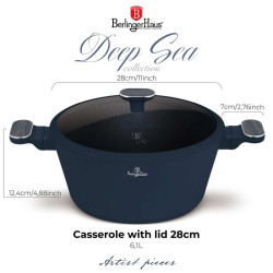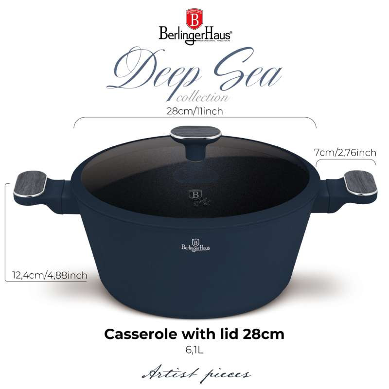 Hrniec na pečenie s pokrievkou 6,3 l - kombinácia funkčnosti a elegancieVarte, pečte a servírujte s priestranným hrncom na pečenie Berlinger Haus z kovaného hliníka s odolným nepriľnavým povrchom TitanPro. Jeho moderný dizajn v matnej modrej farbe so sivými drevenými detailmi z neho robí ozdobu každej kuchyne.Špecifikácie:- Materiál: kovaný hliník s nepriľnavým povrchom TitanPro- Objem: 6,3 l- Rozmery: priemer 28 × 13 cm- Farba: matná modrá so sivými drevenými detailmi- Registrovaný dizajn Berlinger HausVlastnosti:- 3× odolný nepriľnavý povrch TitanPro - varenie bez pripálenia s minimom tuku- ergonomická rukoväť a gombík s mäkkým dotykom, strieborná vložka a sivé drevené prevedenie - chladné na dotyk- Pokrievka z tvrdeného skla so žiaruvzdorným silikónovým systémom Soft-close- Praktický prieduch na odvod pary- Elegantný minimalistický štýl a matný povrch- Indukčné turbo dno pre rýchly a úsporný ohrev- Vhodné pre všetky typy varných dosiek- Šetrné k životnému prostrediu - neobsahuje PFOA, olova a kadmia- Jednoduché čistenieSkvelý a odolný pomocník na každodenné varenie a špeciálne príležitosti, ktorý spája praktickosť s nadčasovým štýlom.