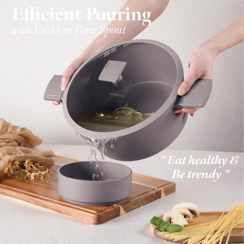 - Materiál: kovaný hliník s nepriľnavým povrchom titánPro - Rozmery: pr. 28*12,4 cm 6,1 l - Farba: matná taupe - Trojvrstvový odolný nepriľnavý povrch titánPro - Ergonomická rukoväť a gombík s mäkkým dotykom Stay Cool - Cediaca pokrievka z tvrdeného skla s tepelne odolným silikónovým systémom Soft Close - Minimalistický štýl - Matná povrchová úprava - Na báze turboindukcie - Vhodné pre všetky typy varných dosiek - Šetrný k životnému prostrediu Neobsahuje PFOA, LEAD, kadmium - Ľahko sa čistí
