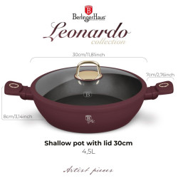 Priestranný, štýlový a dokonale funkčný – ideálny na každodenné varenie aj výnimočné príležitosti. Sýto bordový odtieň dodá vašej kuchyni nádych elegancie. • Materiál: kovaný hliník s nepriľnavým povrchom TitanPro • Rozmery: priemer 30 × 8 cm, objem 4,5 l • Farba: matná bordová • 3× odolný nepriľnavý povrch TitanPro – pre ľahké varenie bez pripaľovania • Ergonomická rukoväť s mäkkým povrchom, ktorá zostáva príjemne chladná • Pokrievka z tvrdeného skla s tichým zatváracím systémom a odolným silikónovým tesnením • Gombík z nerezovej ocele so zlatým PVD povlakom pre luxusný vzhľad • Otvor pre paru pre bezpečný a efektívny ohrev • Minimalistický a nadčasový dizajn • Matný povrch pre moderný vzhľad • Indukčný turbo systém pre rýchle zahriatie • Vhodné pre všetky typy varných dosiek • Ekologicky šetrné – bez PFOA, olova a kadmia • Ľahko sa čistí Leonardo Collection – keď chcete skĺbiť krásu a výkon v každom detaile.