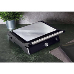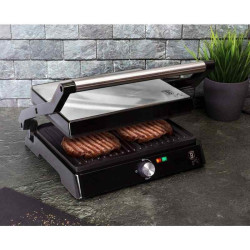 - elektrický domáci kontaktný gril z nerezovej ocele - flexibilné použitie, skvele kombinuje stolný gril na prípravu mäsa a panini gril na prípravu bagiet a sendvičov - ideálny pre grilovanie mäsa, steakov, burgerov, párov, zapekaných sendvičov, bagiet a panini - nepriľnavý povrch grilovacích dosiek zaistí, že sa potraviny nepripaľujú a navyše je veľmi ľahké povrch čistiť - automatický svetelný indikátor prevádzky - ochrana proti prehriatiu - rukoväte sendvičovača zostávajú vždy chladné aj počas použitia - vyberateľná odkvapkávacia zásuvka na tuk - výkon: 2000 W - rozmery grilovacej plochy: 29 x 23 cm