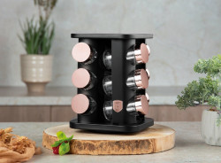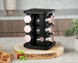 - Veľkosť: 18,5*18,5*21,5 cm - Súčasťou balenia je: - Sada obsahuje 12 ks sklenených nádob na korenie - Objem: 90 ml - Stojanček otočný o 360 ° - Farba: čierno-ružovo zlatá - Priehľadné prevedenie zaisťuje viditeľnosť korenia - Priestorovo úsporný stojan na korenie, 12 ks korenia na jednom mieste - Praktické