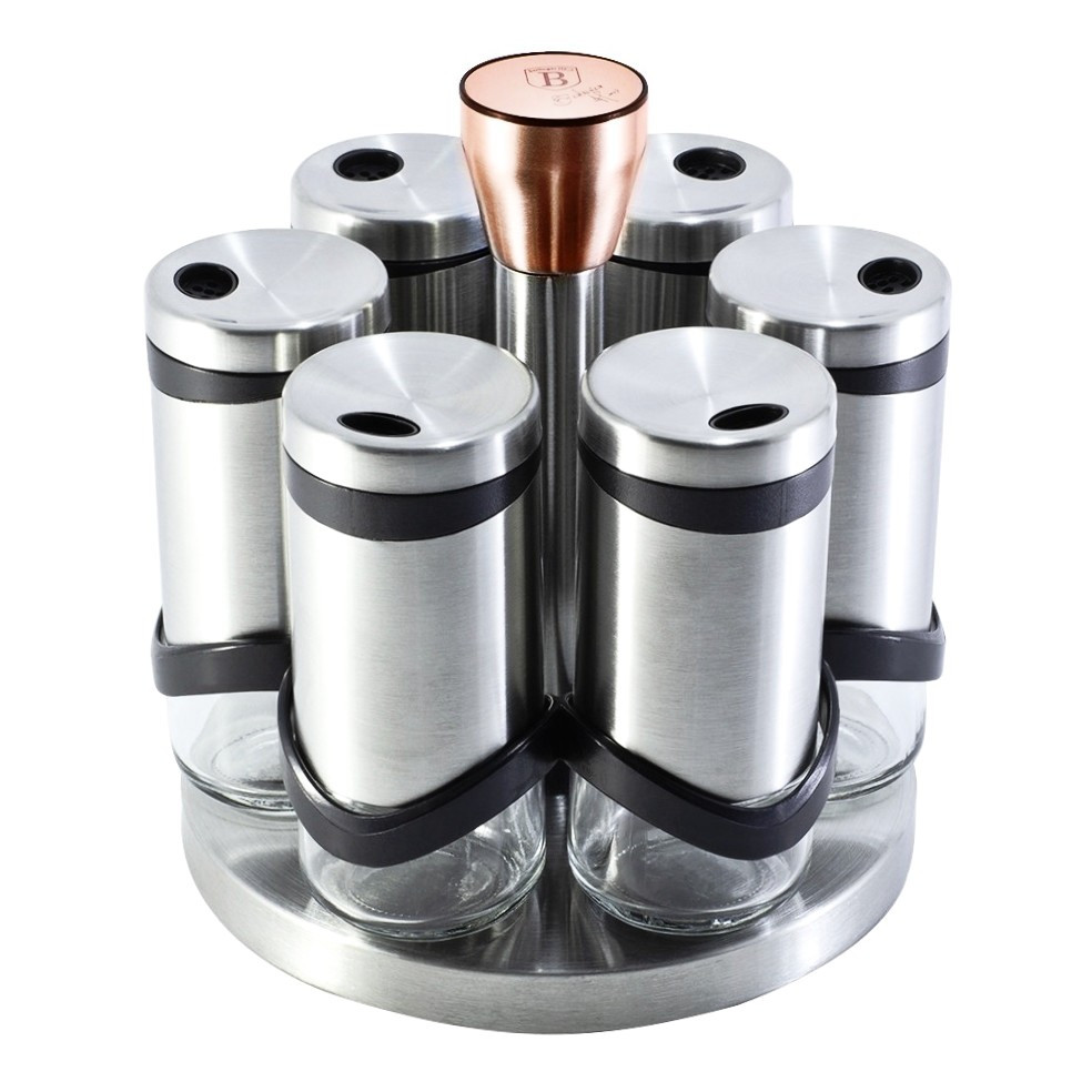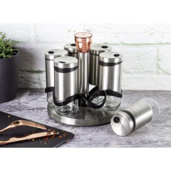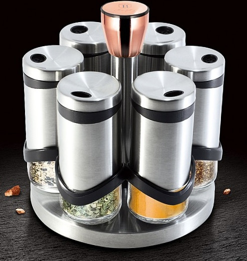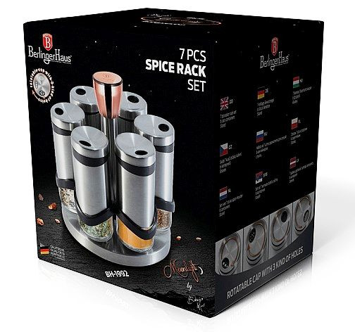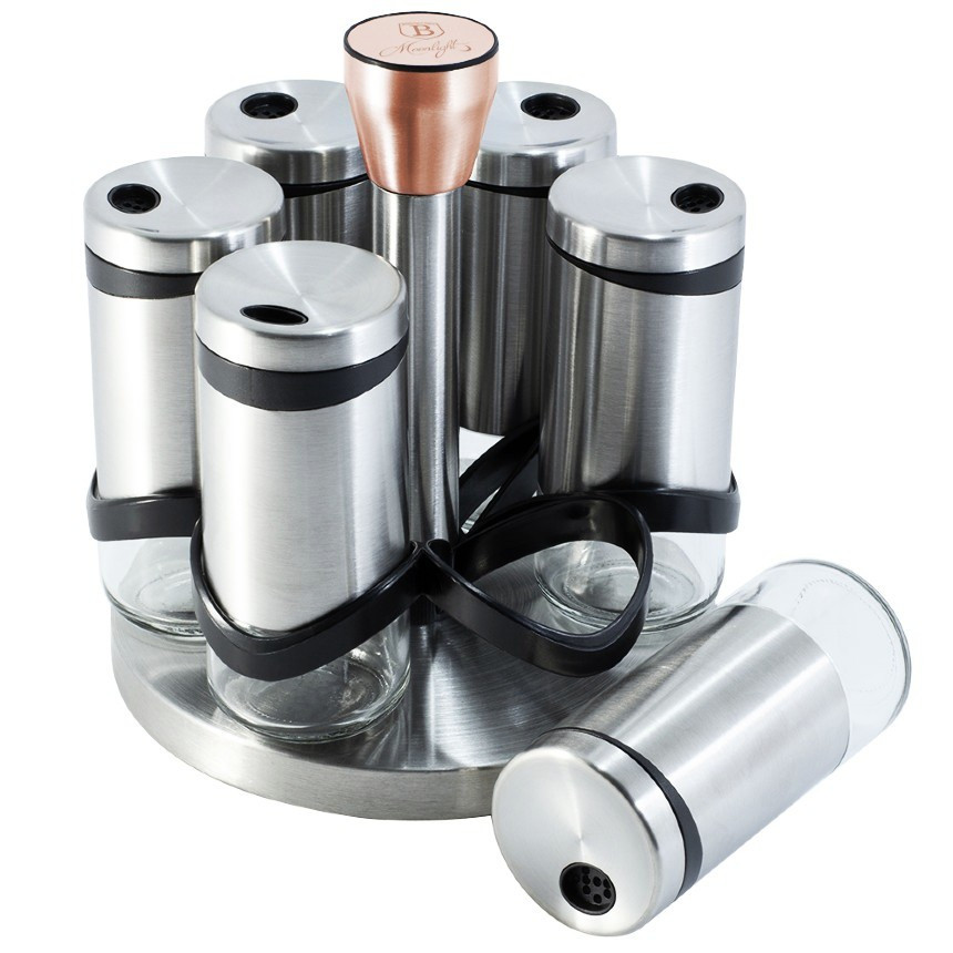 - materiál: nerezová oceľ / sklo - sada obsahuje: stojan, 6x korenička - objem koreničky: 120 ml - nastaviteľná veľkosť otvoru, vhodné na najrôznejšie druhy korenia - otočný stojan s rukoväťou uprostred pre pohodlnú manipuláciu aj prenášanie