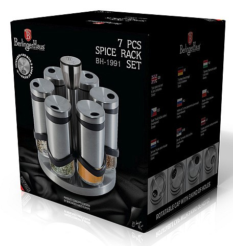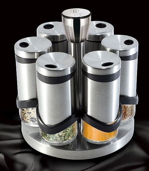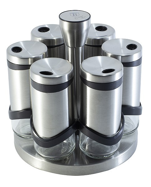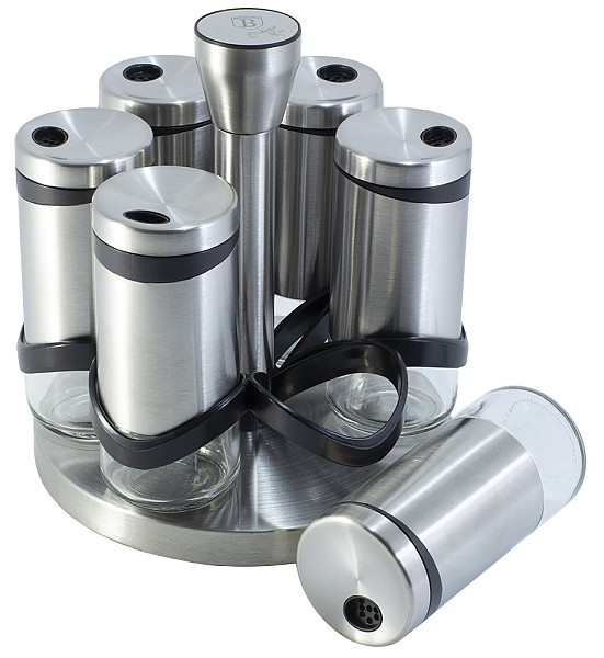 - materiál: nerezová oceľ / sklo - sada obsahuje: stojan, 6x korenička - objem koreničky: 120 ml - nastaviteľná veľkosť otvoru, vhodné na najrôznejšie druhy korenia - otočný stojan s rukoväťou uprostred pre pohodlnú manipuláciu aj prenášanie - výška stojana 18cm - výška koreničky 11,5 cm