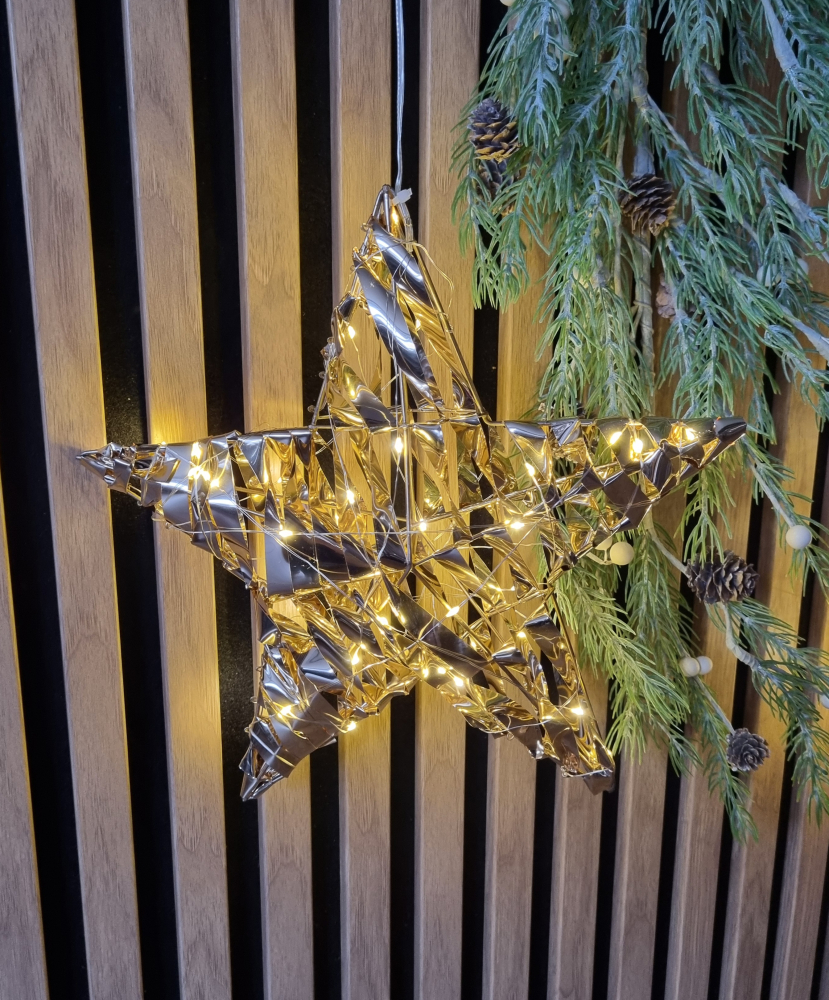 LED Hviezda prinesie do vášho interiéru kúzlo zimných večerov. Jeho jemné, teplé svetlo dodá každej miestnosti jedinečný charakter a vianočnú atmosféru.Kovová svetelná hviezda zlatá 30 cm teplá biela s časovačom - 150 LED - vianočná dekorácia závesná hviezda do interiéru na batérie