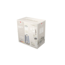 - Materiál: nerezová oceľ, plast - Výkon: 300 W - 220-240 V 50/60 Hz - Nádoba na vybratie s vekom: 570 ml - Farba: nerezová oceľ / krémová - tyč z nerezovej ocele a čepele 18/10 s funkciou drvenia ľadu - Tlačidlo zapnutia/vypnutia - Športová fľaša s ochranou proti obareniu a protišmykovou silikónovou rukoväťou