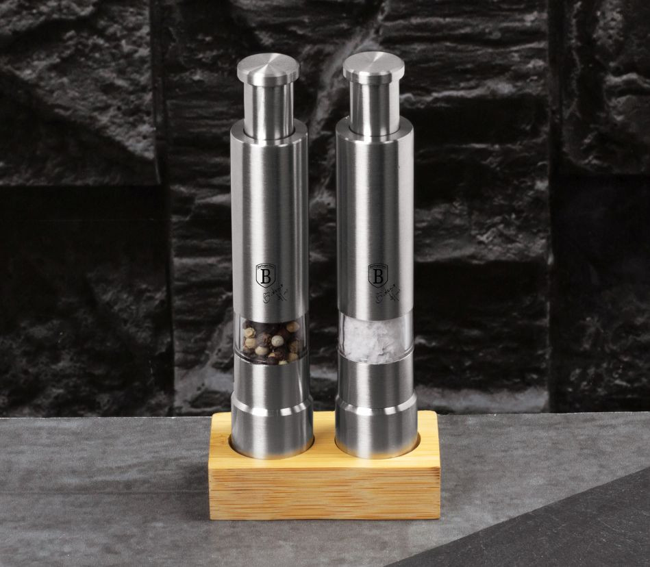materiál: nehrdzavejúca oceľ- mechanická soľnička a korenička drví hrubé korenievhodný na korenie a soľ a iné hrubé korenie- sada obsahuje 2 kusy koreničiek a bambusový stojan