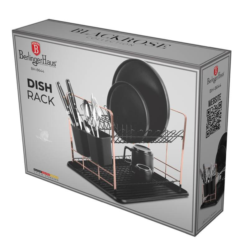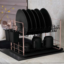 Prakticky vybavený odkvapkávač na riad z kolekcie Black Rose Collection - vyrobený v kombinácii chrómovanej ocele a PP plastu - celkom 2 poschodia pre odkladanie umytého riadu, horný s profiláciou na taniere a spodný rovný - na strane dve priehradky na príbory a kuchynské náčinie - dôležitou súčasťou je odkvapkávacia tácka na vodu - tradičný doplnok do kuchyne navyše v atraktívnom prevedení - rozmery: priemer 48 x 32 x výška 29 cm - farba: čierna/ružovo-zlatá