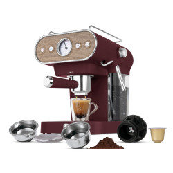 Elegancia a funkčnosť v jednom: espresso kávovar 3 v 1 v matnej bordó farbeObjavte svet dokonalej kávy s naším espresso kávovarom 3 v 1, ktorý spája eleganciu a všestrannosť. Tento espresso kávovar v matnej bordó farbe je určený pre tých, ktorí oceňujú kvalitné espresso a chcú si ho pripraviť v pohodlí domova. Jeho sofistikovaný dizajn v kombinácii s drevenými prvkami z neho robí nielen funkčný spotrebič, ale aj štýlový doplnok vašej kuchyne.Prečo si vybrať náš kávovar: hlavné výhody Všestrannosť 3 v 1: vychutnajte si kávu pripravenú z mletej kávy, kapsúl alebo ESE kapsúl, v závislosti od vašej aktuálnej chuti. Profesionálny napeňovač mlieka. Systém rýchleho ohrevu: Ušetrite čas vďaka rýchlej príprave espressa. tlakové čerpadlo s tlakom 20 barov: Zaručuje vyváženú chuť a bohatú arómu v každej šálke. Moderný dizajn.Kto najviac ocení tento kávovar?Tento kávovar je ideálny pre všetkých milovníkov kávy, ktorí si chcú môcť vybrať medzi rôznymi druhmi prípravy. Je to skvelé riešenie pre domácnosti a kancelárie, kde sa každý deň striedajú rôzne kávové preferencie. Vďaka kompaktnému dizajnu a jednoduchej obsluhe je vhodný aj pre používateľov, ktorí nemajú veľké skúsenosti s prípravou kávy. Nerezový predhrievač šálok a ochrana proti prehriatiu a pretlaku zaručujú bezpečnú a pohodlnú prevádzku.Podrobnosti a technické špecifikácie Materiál: nehrdzavejúca oceľ Príkon: 950 W Napätie: 220-240 V, 50-60 Hz Nádržka na vodu: 1,2 l Filter: pre 1 a 2 šálky Plastová lyžica 2 v 1 s napeňovačom Rozmery: 23 x 26,5 x 30,5 cm Dĺžka napájacieho kábla: 75 cm Farba: matná bordó, drevená Panel s tlačidlovým ovládaním Tlakové čerpadlo: 20 barov Teplomer na monitorovanie teploty vody Odnímateľná a umývateľná odkvapkávacia miskaZažite vôňu čerstvo uvarenej kávy každý deň s naším espresso kávovarom 3 v 1 a zažite pravý kávový rituál v pohodlí domova.