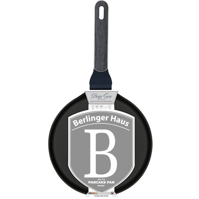 Panvica na palacinky Berlinger Haus 25 cm - TitanProVychutnajte si prípravu dokonalých palaciniek s touto štýlovou mriežkou na palacinky Berlinger Haus z kovaného hliníka s trojvrstvovým nepriľnavým povrchom TitanPro, ktorý zaručuje rovnomerné vyprážanie bez pripálenia.Ergonomická mäkká rukoväť so striebornou vložkou zostáva vždy chladná a bezpečná, zatiaľ čo elegantný matný modrý a sivý drevený povrch dodáva kuchyni moderný minimalistický vzhľad.Vďaka indukčnému turbo systému je panvica vhodná na všetky typy varných dosiek. Jednoduchá údržba a ekologickosť bez PFOA, olova a kadmia zaručujú zdravé a praktické varenie.Špecifikácie:- Materiál: kovaný hliník s nepriľnavým povrchom TitanPro- Rozmery: priemer 25 cm, výška 2,2 cm- Farba: matná modrá, sivé drevo- Ergonomická rukoväť s mäkkým povrchom- Indukčný turbo systém - vhodný pre všetky typy varných dosiek- Minimalistický dizajn, matný povrch- Jednoduché čistenie- Bez PFOA, olova a kadmiaIdeálna panvica na chutné a dokonale prepečené palacinky každý deň.