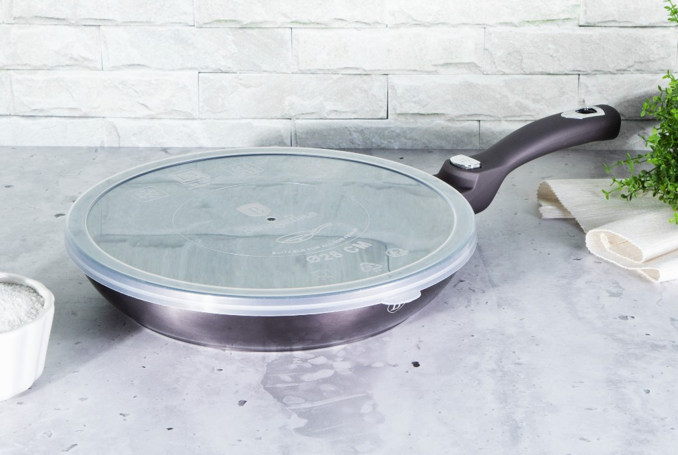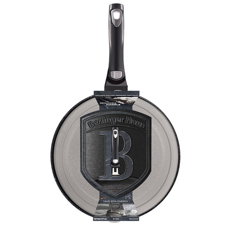 Univerzálna veľká nepriľnavá panvica s mramorovým dizajnom a odnímateľnou rukoväťou v atraktívnom dizajne Carbon PRO. Panvica je potiahnutá 3-vrstvovým mramorovým povrchom, ktorý sa vyznačuje dokonalými nepriľnavými vlastnosťami, pripravované pokrmy sa nepripaľujú a vďaka tomu sa panvica veľmi ľahko čistí. Je vhodná aj na zdravé varenie s minimom tuku alebo oleja, v závislosti od použitých surovín dokonca bez jedinej kvapky tuku. Stlačením tlačidla možno z panvice odňať odnímateľnú rukoväť a panvicu potom vložiť do rúry na pečenie alebo rovno do rúry. Rukoväť sa dá ľahko nasadiť a odňať jednou rukou. Oceníte ju aj pri skladovaní alebo údržbe. Súčasťou panvice je aj praktické veko, ktorým ju môžete uzavrieť.- vnútorná a vonkajšia vrstva neobsahuje žiadne škodlivé látky, takže výsledný pokrm varením nestráca vitamíny- kované hliníkové jadro panvice je vysoko stabilné a má dokonalú tepelnú vodivosť, takže sa nielen rýchlo a rovnomerne zahrieva po celom povrchu, ale aj veľmi ľahko udržiava teplotu počas varenia- zosilnené dno Turbo Induction z nehrdzavejúcej ocele pre maximálnu účinnosť varenia- ergonomicky tvarovaná rukoväť má protišmykovú povrchovú úpravu soft-touch, vďaka ktorej skvele padne do ruky, ľahko sa s ňou manipuluje a umožňuje pevné a bezpečné uchopenie- vďaka izolačným prvkom zostáva rukoväť počas celého procesu varenia chladná a nepripaľuje sa- telo panvice je zakončené zosilneným okrajom pre lepšiu odolnosť voči nárazom- vhodná pre všetky typy sporákov a indukciu- plne odnímateľná rukoväť umožňuje použitie v rúre do 200 °C- súčasťou balenia je plastová pokrievka na praktickejšie a pohodlnejšie používanie- vďaka vynikajúcim nepriľnavým vlastnostiam mramorového povrchu je čistenie rýchle a jednoduché, stačí umyť teplou vodou a hubkou- možno umývať aj v umývačke riadu- ideálny na každodenné varenie, vyprážanie a pečenie akéhokoľvek druhu- Šetrný k životnému prostrediu, použité materiály neobsahujú žiadne škodliviny, ako je Pfoa, olovo alebo kadmium- vysoko atraktívny moderný dizajn s jedinečnou metalickou vonkajšou farbou- panvica je vďaka svojmu dokonalému vzhľadu vhodná aj na servírovanie jedla priamo na stôl- rozmery: priemer horného okraja 28 x výška 5,2 cm- objem: 2,4 l- rúra: 220 °C (bez rukoväte)- indukcia: áno- sklokeramika: áno- plyn: áno- elektrina: áno- veko: plastové veko - nie je vhodné do rúry- farba: tmavosivá karbónová, metalická- kolekcia: Carbon PRO Line Nielen poháre, hrnce a príbory sú nepostrádateľným kuchynským vybavením, ale aj panvice. Vďaka nim bude príprava vašich obľúbených pokrmov jednoduchšia a práca s nimi ľahšia! Bez kvalitnej panvice by ste svoj talent v kuchyni naplno nevyužili! Zaobstarajte si panvicu na vyprážanie, pečenie alebo grilovanie mäsa, zeleniny a iných surovín. Príprava jedla bude rýchlejšia a na tanieri budete mať zdravé jedlo.Typy kuchynských panvícV našej ponuke panvíc nájdete rôzne typy panvíc na široké spektrum použitia. S grilovacou panvicou môžete doma pripravovať mäso a zeleninu rovnako ako na grile. Na prípravu cestovín a polievok použite hlboké panvice. Panvice na palacinky sú ideálne na prípravu tenkých palaciniek, panvice na prípravu lievancov a servírovacie panvice ozdobia slávnostný stôl a udržia jedlo teplé. Všestranná panvica wok je skvelá na prípravu ázijských jedál. V panvici WOK môžete pri vysokých teplotách rýchlo opiecť mäso a zeleninu a jedlo bude mať lahodnú chuť a vôňu.Panvica v čiernej farbe sa bude vo vašej kuchyni určite vynímať!