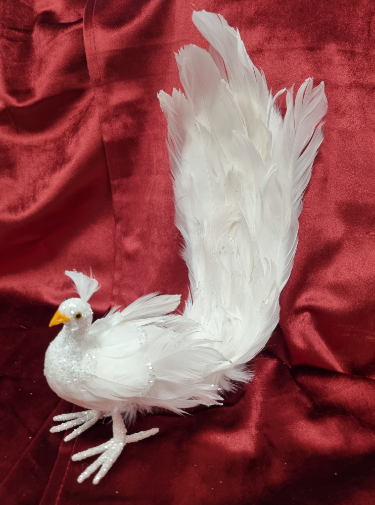 Luxusné vianočné dekorácie BIELY PÁV s pravým perím a flitrami. Biely páv s dĺžkou 40 cm sa stane dominantou stromčeka, stola či aranžmánu a vnesie do interiéru noblesu, eleganciu a kúzelnú zimnú atmosféru.Jeho dlhé pierka evokujú nežný dotyk zimného sna a premenia každý aranžmán na zážitok plný noblesy. Tento páv nie je len ozdobou – je to dominanta interiéru , ktorá priťahuje pohľady a vyžaruje pokoj aj slávnostnú krásu.