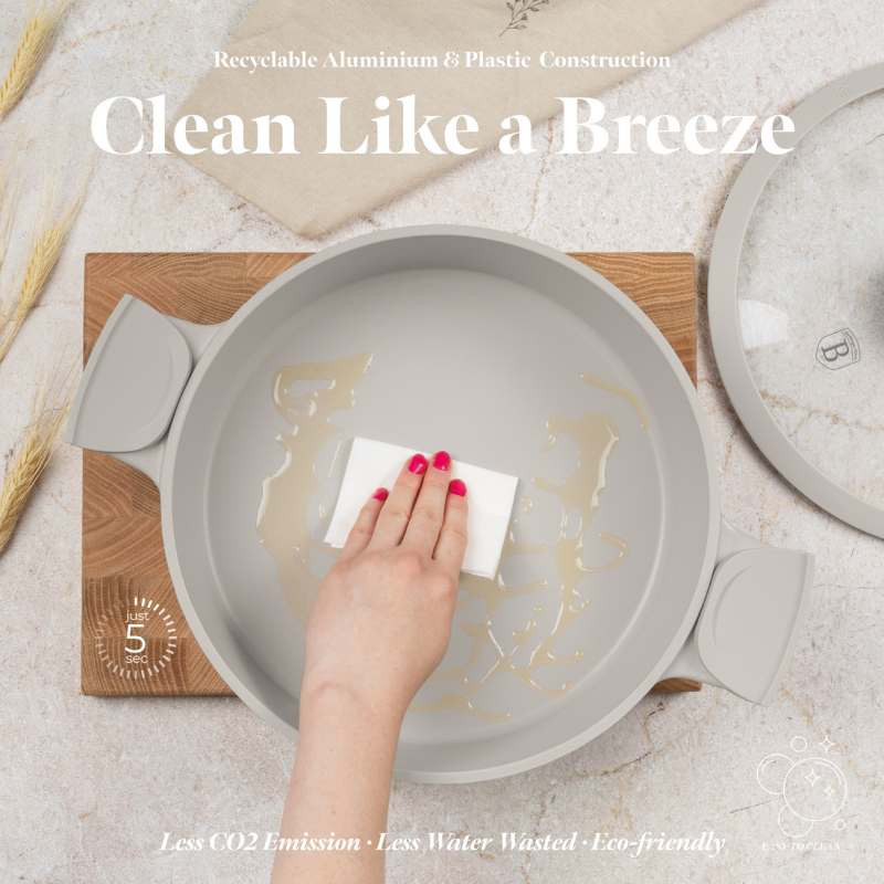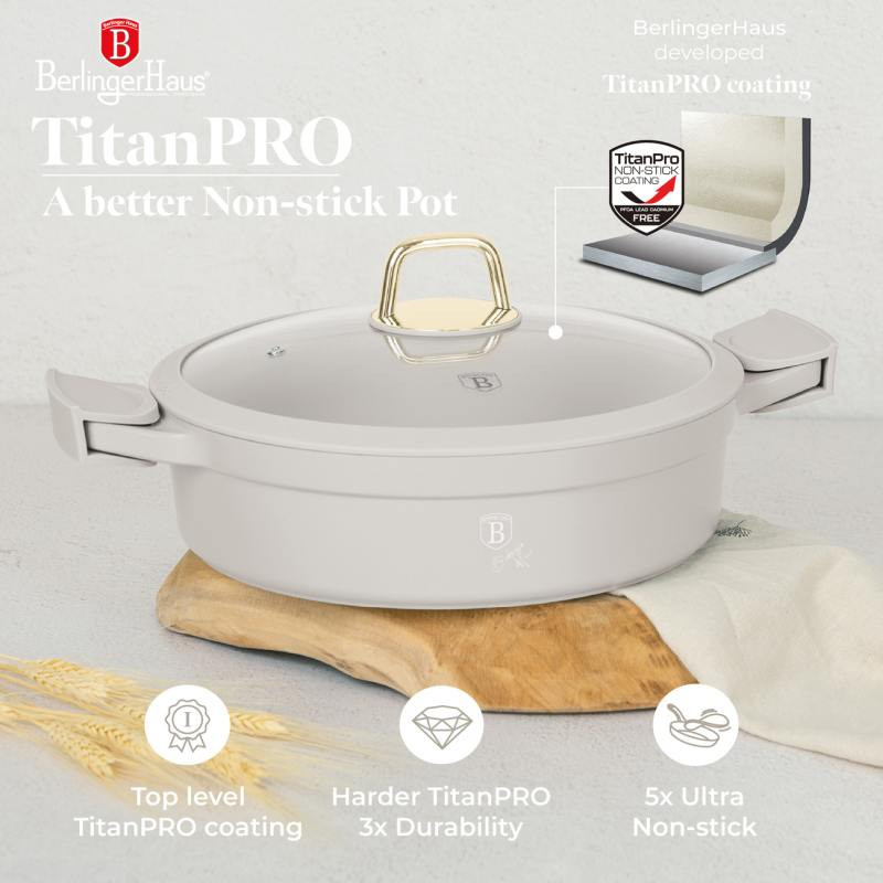 Objavte dokonalosť s plytkým hrncom Berlingerhaus BH-7785 s priemerom 34 cm. Tento elegantný a výkonný hrniec je navrhnutý tak, aby spĺňal všetky vaše kuchynské potreby. S jeho robustnou konštrukciou a titánovým povrchom zvládnete ľahko a rýchlo pripraviť akýkoľvek pokrm. - Materiál: Liaty hliník s trojvrstvovým titánovým povrchom pre dlhú životnosť a ľahké čistenie. - Kapacita: 3,8 litra, ideálna pre väčšie porcie. - Design: Krémová farba, ktorá dodá vašej kuchyni elegantný a moderný vzhľad. - Bezpečnostné prvky: Odnímateľné silikónové rukoväte odolné voči teplu pre bezpečnú manipuláciu. - Pokrievka: Tvrdené sklo s mäkkým silikónovým okrajom a zlatým PVD povlakom na nerezovej ocele. - Turbo indukčná základňa: Riad má turbo indukčnú základňu, ktorá umožňuje jeho použitie na všetkých typoch varných dosiek, takže sa nemusíte báť, že by ste ho nemohli použiť na svojej novej varnej doske. - Šetrné: Sada riadu Matte Black Collection neobsahuje PFOA, olovo ani kadmium, čo z nej robí ekologickú a zdravú voľbu pre vašu kuchyňu. - Očista: Vďaka nepriľnavému povrchu sa riad ľahko čistí, čo šetrí čas v kuchyni. Možno ich tiež umývať v umývačke, takže sa ešte ľahšie čistia. S plytkým hrncom Berlingerhaus BH-7785 môžete pripraviť zdravé a chutné pokrmy rýchlo a efektívne. Vďaka nepriľnavému povrchu je čistenie ľahké a rýchle. Tento hrniec je multifunkčný, takže s ním môžete vykonávať mnoho úloh a vždy dosiahnete tie najlepšie výsledky.