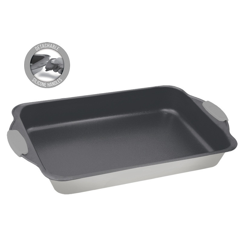 • Materiál: uhlíková oceľ • Veľkosť: 36 * 23 * 6 cm • Farba: saténovo šedá • ZADARMO 2 KS ŽIARUVZDORNÉ SILIKÓNOVÉ RUKOVÄTI • Sivý nepriľnavý povrch • Odnímateľné silikónové rukoväte • Maximálna teplota použitia v rúre +220°C - ľahko sa čistí! • Šetrné k životnému prostrediu • Vhodné variť rôzne druhy potravín v rovnakom čase
