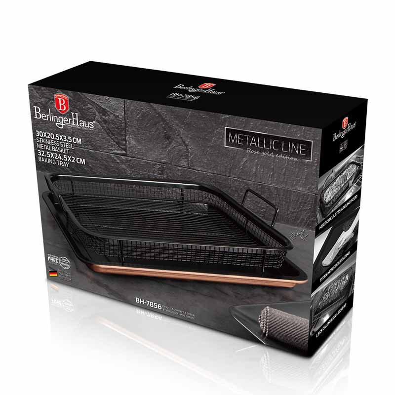 Plech na pečenie s titánovým povrchom a kovovým košom 30 x 20,5 cm Black Rose Collection. Táto sada pečiacej tácky s kovovým košom je vyrobená z uhlíkovej ocele s titánovou nepriľnavou vrstvou, ktorá zaisťuje vysokú kvalitu a odolnosť. Súprava obsahuje kovový kôš z nerezovej ocele. Veľkosť tácky je 32,5x24,5x2 cm a veľkosť košíka je 30x20,5x3,5 cm. Metalická ružová zlatá farba a elegantný dizajn dodávajú tejto sade moderný vzhľad, ktorý sa hodí do každej kuchyne. Kľúčové vlastnosti: - Materiál: Uhlíková oceľ s titánovou nepriľnavou vrstvou. - Obsah sady: Kovový kôš z nerezovej ocele. - Veľkosť: Tácka 32,5x24,5x2 cm, košík 30x20,5x3,5 cm. - Farba: Metalické ružové zlato. - Povrch: Titán nepriľnavý povrch. - Design: Štýlový a elegantný dizajn s kovovou vonkajšou farbou. - Ekologicky šetrné: Bez PFOA, olova a kadmia. - Údržba: Ľahko sa čistí. Prečo si ju zamilujete: Kvalita: Vyrobené z uhlíkovej ocele s titánovou nepriľnavou vrstvou pre dlhú životnosť. Štýlový dizajn: Metalická ružová zlatá farba a elegantný dizajn dodajú vašej kuchyni moderný vzhľad. Praktické použitie: Jednoduché čistenie a ekologicky šetrné materiály. Vylepšite svoje pečenie s touto sadou tácky na pečenie a koša a užite si radosť z prípravy jedla každý deň.