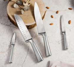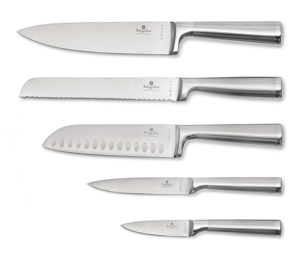 - Materiál: nerezová oceľ 3cr13 s rukoväťou v saténovom a zrkadlovom lesku. - Kuchársky nôž 20 cm - Krájací nôž 20 cm - Nôž na chlieb 20 cm - Úžitkový nôž 12,5 cm - Nôž na okrajovanie 9 cm - Stojan BAMBOO- Farba: nerezová oceľ / čierna - ČEPELA VYRÁBANÉ NOVOU VÝROBNOU TECHNOLÓGIOU - Bambusový blok - Laserom ostrené čepele - Vyrobené z jedného kusu - Ergonomická rukoväť - Konštrukcia s chráničom prstov