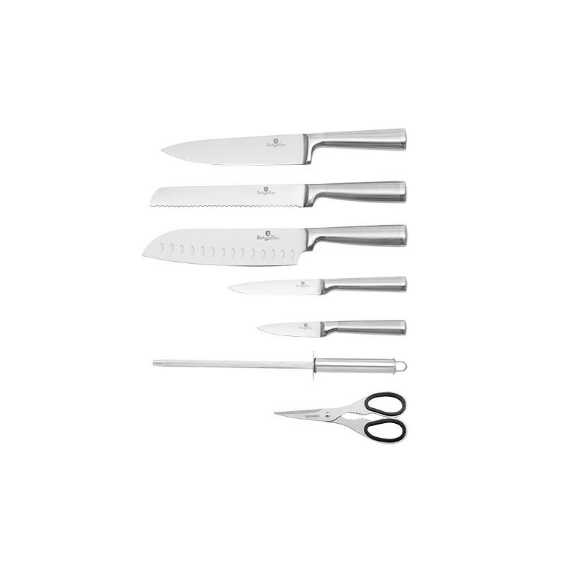 - Materiál: nerezová oceľ 3cr13 s rukoväťou v saténovom a zrkadlovom lesku. - Kuchársky nôž 20 cm - Nôž na chlieb 20 cm - Nôž Santoku 17,5 cm - Úžitkový nôž 12,5 cm - Nôž na okrajovanie 9 cm - Ocieľka - Nožnice - 360 ° akrylový stojan - REGISTROVANÝ DIZAJN BERLINGER HAUS!!! - ČEPELA VYROBENÁ NOVOU VÝROBNOU TECHNOLÓGIOU - Presné laserom rezané ostrie z nerezovej ocele - Ergonomicky navrhnutá odolná protišmyková rukoväť, ktorá je ideálna pre rýchlu prípravu pokrmov - Čepeľ dokonale zapadá do stojana - Akrylátový stojan otočný o 360 ° - Štýlový
