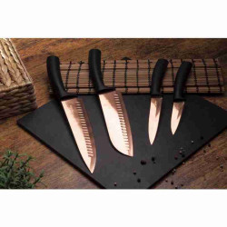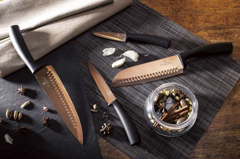 - Materiál: nehrdzavejúca oceľ s titánovou nepriľnavou vrstvou- Kuchársky nôž 20 cm- Nôž Santoku 17,5 cm- Užitkový nôž 12,5 cm- Nôž na okrajovanie 9 cm- Farba: čierno-ružovo-zlatá ružovo-zlatá- ČEPELE VYROBENÉ NOVOU VÝROBNOU TECHNOLÓGIOU- Ergonomická rukoväť s mäkkým povrchom- Titánové čepele- Laserom ostrené čepele- Priehlbiny na čepeli- Štýlový- Špeciálna edícia Rose Gold