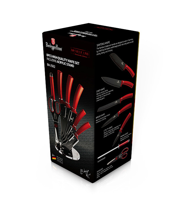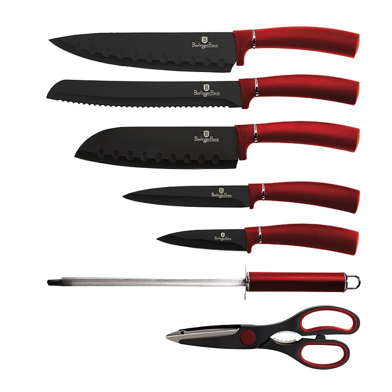 - materiál: nehrdzavejúca oceľ s nepriľnavým povrchom- diamantový nepriľnavý antibakteriálny povrch- neprenáša pachy krájaných potravín a neničí vitamíny- ergonomicky tvarovaná mäkká rukoväť s bezpečnostnou zarážkou na prsty- Sada 8 kusov obsahuje:- Nôž Santoku 17,5 cm- kuchársky nôž 20 cm- nôž na pečivo 20 cm- univerzálny krájací nôž 12,5 cm- lúpací nôž 9 cm- brúska - nožnice- 360° otočný stojanKvalitná súprava nožov do kuchyneRýchla a bezpečná príprava všetkých druhov surovín, ktoré si zachovajú svoju výživovú hodnotu, chuť a vôňu . Výsledkom vašej práce budú chutné a zdravé jedlá.Súprava nožov Burgundy Metallic Line v stojane s nepriľnavým povrchom 8 ks je vynikajúcou alternatívou pre kuchárov rôznych úrovní, na výrobu ktorej bol použitý kvalitný materiál: nehrdzavejúca oceľ s nepriľnavým povrchom, vynikajúca ostrosť čepele a dizajn. Oceníte aj ergonomicky tvarovanú rukoväť, vďaka ktorej sa nože skvele držia. Celá súprava je dielom výrobcu BerlingerHaus, ktorý nože vyrába už pomerne dlho a sú riadne otestované.Aké nože sú súčasťou základnej sadyAk pripravujete základné suroviny, budete s touto súpravou maximálne spokojní, pretože obsahuje 8 univerzálnych, kvalitných nožov. Sú vyladené tak, aby ste mohli pracovať so všetkými štandardnými surovinami v kuchyni.Aké sú výhody súpravy kuchynských nožovNože si môžete kúpiť po jednom alebo si kúpiť celú sadu nožov naraz a ušetriť čas, peniaze a mať hneď po ruke nože rôznych typov. Súprava nožov ponúka niekoľko výhod:Nože a ďalšie príslušenstvo v súprave sú od jedného výrobcu ( BerlingerHaus).Každá súprava má svoj jedinečný a zladený dizajn. Nože majú vlastný jedinečný dizajn a osobitý dizajn a stávajú sa zaujímavým kuchynským doplnkom.Súprava vám vydrží niekoľko rokov - vďaka ocieľke alebo brúsnemu kameňu, ktoré sú súčasťou niektorých súprav, sa ľahko udržiavajú ostré.Ergonomická rukoväť zaručuje, že sa vám s nožmi bude pracovať skvele a bezpečne.Budete ich mať rýchlo po ruke a rôzne typy nožov vám pomôžu nakrájať napríklad pečivo, zeleninu a iné prísady.Súpravu môžete ľahko doplniť o ďalšie príslušenstvo - nožnice, škrabky na zeleninu a ovocie, praktický stojan (blok) alebo magnetickú lištu, ocieľku alebo brúsku.