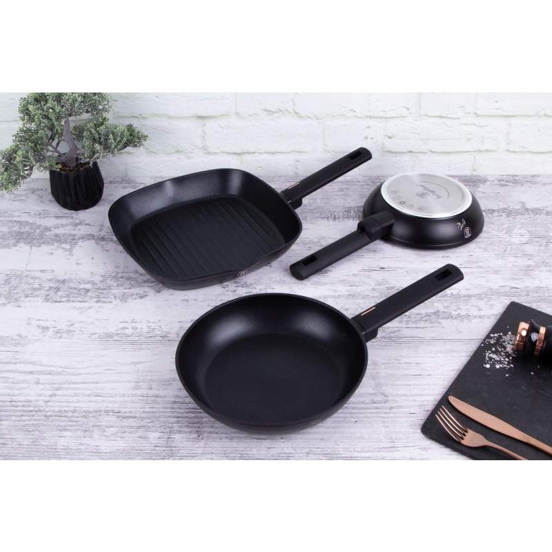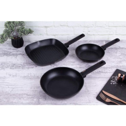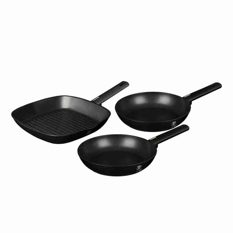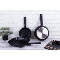 Sada 3 ks panvíc, kolekcia Monaco • Materiál: kovaný hliník s čiernym titánovým nepriľnavým povrchom • Zahrnúť: • Panvica O20*4,5 cm 1,0L • Panvica O24*4,8 cm 1,7L • Grilovacia panvica O28*4,1 cm 2,1L • Farba: matná čierna • Hrubostenný materiál tela z kovaného hliníka • Ergonomická rukoväť Soft-touch • Plná indukcia • Vhodné pre všetky typy varných dosiek vrátane indukčných (úspora energie!) • Elegantný dizajn • Ekologicky šetrné Bez PFOA, olova, kadmia • Ľahko sa čistí