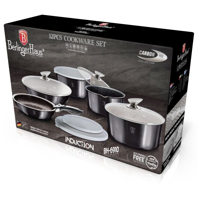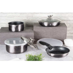 Jedinečná sada riadu s odnímateľnou rukoväťou z novej kolekcie Carbon PRO Line. Doménou tejto sady je praktická CLICK rukoväť, vďaka ktorej môžete celú sadu použiť v rúre aj na sporáku. Všetky nádoby sú stohovateľné do seba a tak Vám celá sada riadu v kuchyni zaberú iba jednu poličku. Odnímateľná rukoväť je kompatibilná so všetkými kusmi riadu. Je ergonomicky tvarovaná a pohodlne sa drží. Jej odobratie a následné pripnutie jedným pohybom trvá sotva sekundu. Pokojne môžete na sporáku variť vo všetkých nádobách a ľubovoľne medzi nimi rukoväť prepínať. Súčasťou sady sú dve sklenené pokrievky a tiež dve skladovacie veká, ktoré nádoby spoľahlivo uzavrú, keď v nich budú napríklad hotové pokrmy - 3-vrstvový povrch s mramorovým dizajnom je charakteristický svojou dokonalou nepriľnavosťou, žiadne potraviny sa nepripaľujú a vďaka tomu sa kastróly aj panvice veľmi ľahko čistia - zároveň je vhodný na zdravé varenie s minimom tuku, v závislosti na použitých surovinách pokojne aj bez jedinej kvapky tuku - vnútorná aj vonkajšia vrstva neobsahujú žiadne škodliviny, výsledné pokrmy tak nestrácajú varením svoje vitamíny - zosilnené nerezové Turbo indukčné dno pre maximálnu efektivitu prípravy pokrmu - energeticky úsporné varenie zaisťuje korpus z odolného kovaného hliníka, ktorý sa rýchlo nahrieva po celom povrchu a má perfektnú tepelnú vodivosť - odnímateľnú rukoväť je možné ľubovoľne používať ku všetkým kusom riadu - rukoväť zostáva aj pri varení na sporáku vždy chladná - telo kastrólov i panvíc je zakončené širokým okrajom, s ktorým pohodlne prelejete obsah bez kvapnutia - celá sada je vhodná na všetky druhy sporákov aj na indukciu - bez rukoväte a pokrievky je možné všetky nádoby vložiť do rúry do teploty až 220°C - vďaka nadštandardným nepriľnavým vlastnostiam je čistenie rýchle a nenáročné, stačí umyť teplou vodou a hubkou - vhodné tiež do umývačky riadu, na zachovanie dlhotrvajúceho bezchybného stavu sa odporúča šetrný program - celú sadu je možné veľmi jednoducho stohovať do seba, čo ušetrí veľa miesta pri skladovaní - ideálny pre každodenné varenie, dusenie, vyprážanie aj zapekanie - použité materiály neobsahujú žiadne škodliviny ako Pfoa, olovo ani kadmium - v jednotlivých nádobách je možné veľmi pohodlne servírovať hotové pokrmy priamo na stôl - túto sériu je možné doplniť o množstvo jednotlivých kusov riadu, príslušenstva, sady nožov či spotrebičov - farba: tmavo šedá karbón, metalická - kolekcia Carbon PRO Line - kompletná sada 12 ks obsahuje: - panvica 24 x 4,8 cm / 1,7 litra - panvica s pokrievkou 28 x 5,2 cm / 2,4 litra - kastról s výlevkou 16 x 7,5 cm / 1,3 litra - kastról s pokrievkou 18 x 8 cm / 1,8 litra - kastról s pokrievkou 20 x 10 cm / 2,4 litra - odnímateľná rukoväť - 3 x plastové veko Hľadáte vhodnú sadu riadu do vašej kuchyne? Sadou získate všetky potrebné nádoby na varenie , či už budete variť pre seba alebo pre viac osôb. Veľkou výhodou je, že môžete objednať naraz viac riadu od overeného výrobcu BERLINGERHAUS. Sadu riadu zjednocuje jednotný dizajn , navyše čierna farba celej sady je univerzálna a vynímať sa bude v každej kuchyni. Sada riadu s odnímateľnou rukoväťou 12 ks Carbon PRO Line dodá vášmu vareniu nový rozmer Budete môcť variť rôzne jedlá súčasne a tým ušetríte čas a efektívne budete využívať aj kuchynskú plochu. Budete mať na jednom mieste riad vhodný na varenie rôznych druhov pokrmov – dusenie mäsa, varenie polievok, ryže, cestovín alebo na prípravu omáčok.