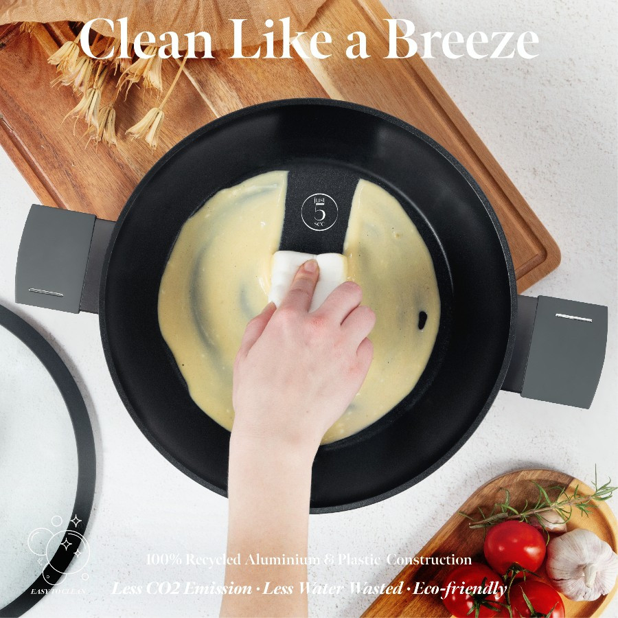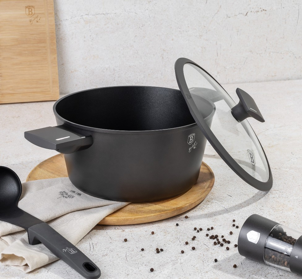 - Materiál: kovaný hliník s nepriľnavou vrstvou TitaniumPro- Súčasťou balenia: - Hlboká panvica 24*6,5 cm 2,3 l.- 28*5,2 cm 2,4 l- 20*10,4 cm 2,5 l- Kastról s cediacou pokrievkou pr. 24*11,8 cm 4,1L- Kastról s cediacou pokrievkou 28*12,4 cm 6,1L- Panvica na omáčku s pokrievkou 16*7,5 cm 1,2L- 3 kuchynské nástroje (obracačka s drážkou, naberačka na špagety, naberačka na polievku)- 2 čierne bakelitové misky MAT- Farba: matná antracitová- trojvrstvový odolný nepriľnavý povrch TitaniumPro- Ergonomická rukoväť a mäkký dotykový gombík Stay Cool- Pokrievka z tvrdeného skla so žiaruvzdorným silikónovým systémom Soft Close- Otvor na paru- Minimalistický štýl - Matný povrch- Na báze turboindukcie- Vhodný pre všetky typy varných dosiek- Šetrný k životnému prostrediuNeobsahuje PFOA, olovo, kadmium- Ľahko sa čistí