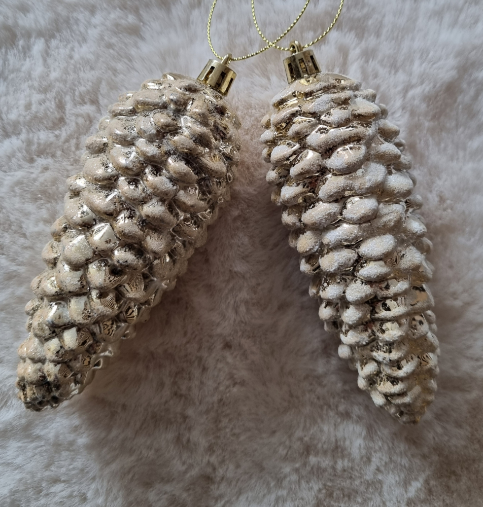 Sada obsahuje 4 ks vianočných ozdôb v tvare krémovo - zlatých šišiek, ktoré sa trblietajú a lesknú a vyzerajú ako by boli pokryté snehom. Tieto ozdoby pristanú každému vianočnému stromčeku a perfektne doladia sviatočnú atmosféru.