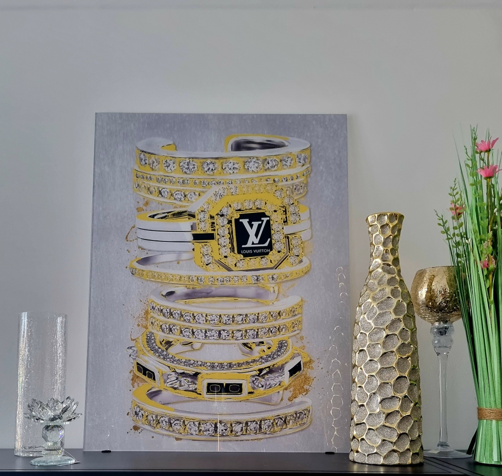 Dekoratívny obraz v štýle GLAMOUR luxusných náramkov je vynikajúcim nápadom na spestrenie steny v obývacej izbe, spálni alebo predsiene , ktorý okamžite pritiahne pohľad a dodá priestoru nádych luxusu. Jemné, lesklé sklo vytvára unikátnu hĺbku a pôsobí ako zrkadlo svetla, ktoré rozjasní miestnosť a zväčší ju opticky. Obraz ,ktorý môže byť tiež dobrým nápadom na darček pre najbližšiu osobu či milovníkov luxusu.