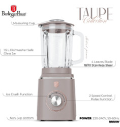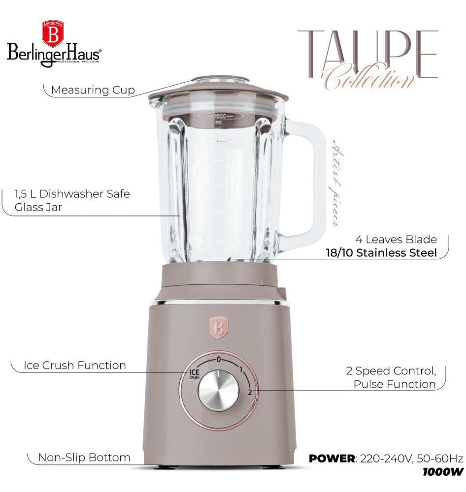 - Materiál: plast, sklo - Výkon: 1000 W - Napätie: 220-240 V, 50-60 Hz - Sklenená nádoba s objemom 1,5 l - Farba: matná šedohnedá taupe - Funkcia: mixovanie, smoothie, drvenie ľadu - 2 rýchlosti s pulznou funkciou - Ochrana proti prehriatiu - Čepeľ zo 4 listov z nerezovej ocele - uzatvárateľný otvor vo veku na pridávanie ingrediencií počas použitia + odmerka