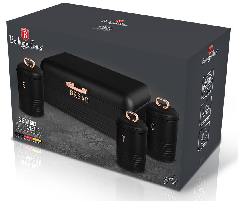 - sada 3 kusov designových dóz na potraviny a chlebovka z kolekcie Black Rose Collection - telo aj veko sú vyrobené z nerezovej ocele - určené predovšetkým na skladovanie suchých potravín a pečiva - dózy sú ideálne na kávu, čaj, cukor, múku, cestoviny, bylinky, škrupiny, atď. - vo chlebníku môžete skladovať všetky druhy pečiva, ktoré tak vydržia dlhšie čerstvé - štýlové riešenie ako uchrániť potraviny pred vlhkosťou, nečistotami alebo pred hmyzom - nerezová oceľ je netoxická a neabsorbuje pachy potravín - jednoduchá údržba - kuchynské dózy a chlebníky BerlingerHaus vo veľmi atraktívnom prevedení sú designovým a hlavne funkčným doplnkom do kuchyne - sada obsahuje 4 kusy: 3x dóza + 1x chlebník - rozmery dóz: 11,5 x 19 cm - rozmery chlebovky: 42,5 x 23 x 16 cm - farba: čierna / rosegold - kolekcia: Black Rose Collection Súprava, obsahujúca 3 kusy dizajnových dóz na potraviny a chlebovku z kolekcie Black Rose Collection. Telo aj veko sú vyrobené z nerezovej ocele a sú určené predovšetkým na skladovanie suchých potravín a pečiva, ako sú káva, čaj, cukor, múka, cestoviny, bylinky a škrupinové plody. Vo chlebníku môžete skladovať všetky druhy pečiva, ktoré tak vydržia dlhšie čerstvé. Štýlový dizajn dóz chráni potraviny pred vlhkosťou, nečistotami a hmyzom. Nerezová oceľ je netoxická a neabsorbuje pachy potravín. Dózy a chlebovka sú ľahko udržiavateľné v čistote a sú veľmi atraktívnym doplnkom do kuchyne. Súprava obsahuje celkom 4 kusy: 3x dóza + 1x chlebník. Rozmery dóz sú 11,5 x 19 cm a rozmery chlebovky sú 42,5 x 23 x 16 cm. Táto sada je vo farbe čierna/rosegold a nesie značku Berlingerhaus.