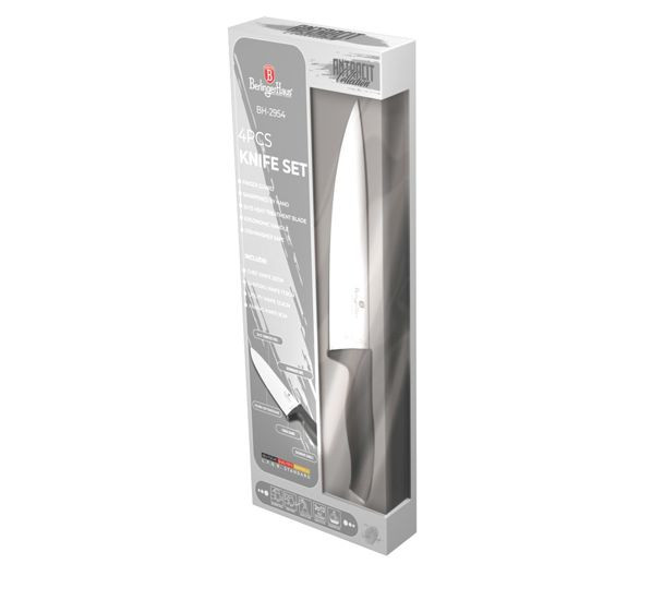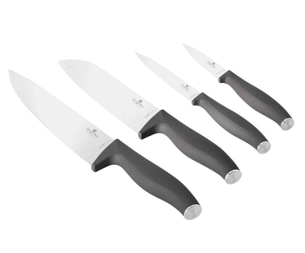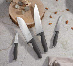 - Vysoko kvalitná nerezová oceľ - Tepelné spracovanie čepele - Ergonomická rukoväť Soft Touch - Ochrana prstov - Ručne ostrené - Elegantný design - Farba: šedá - sada 4 ks obsahuje: - kuchársky nôž 20 cm - nôž Santoku 17,5 cm - univerzálny nôž 12,5 cm - kuchynský nôž 9 cm